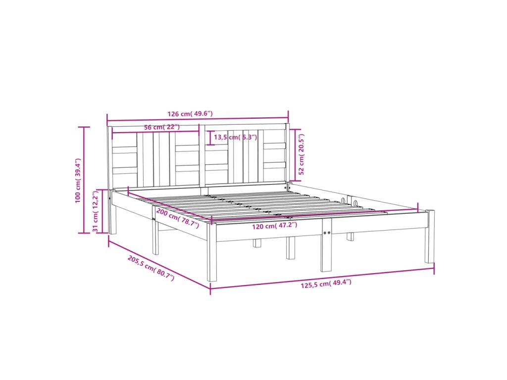 - Rozměry rámu postele: 205,5 x 125,5 x 31 cm (D x Š x V)