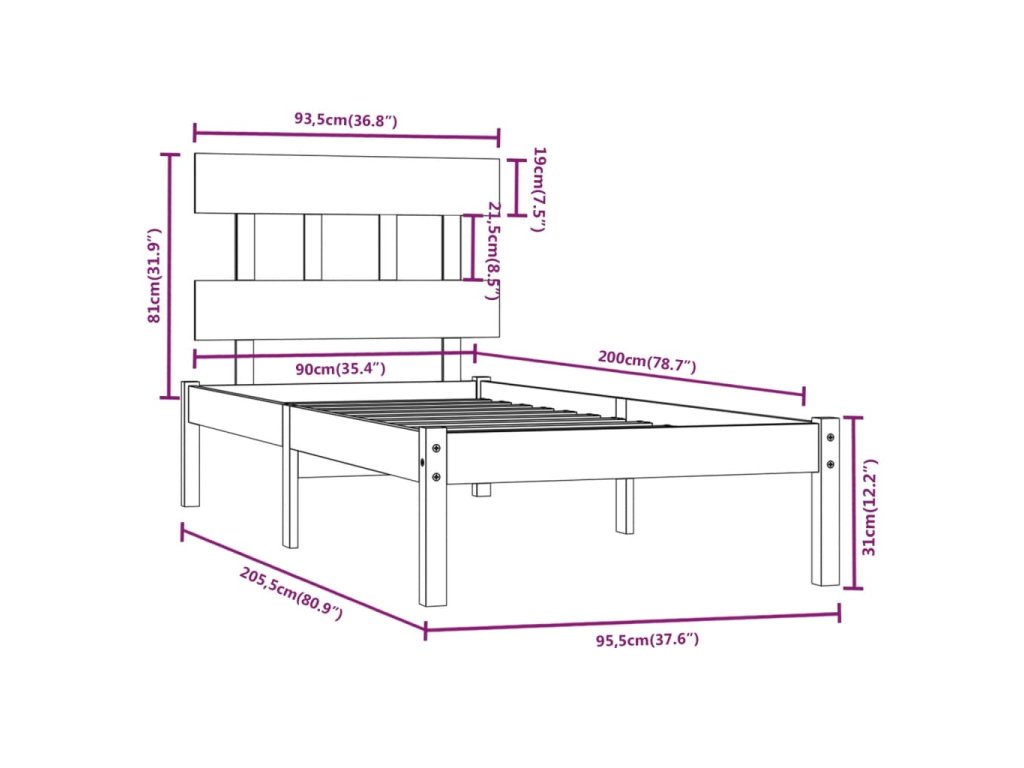 - Rozměry rámu postele: 205,5 x 95,5 x 31 cm (D x Š x V)