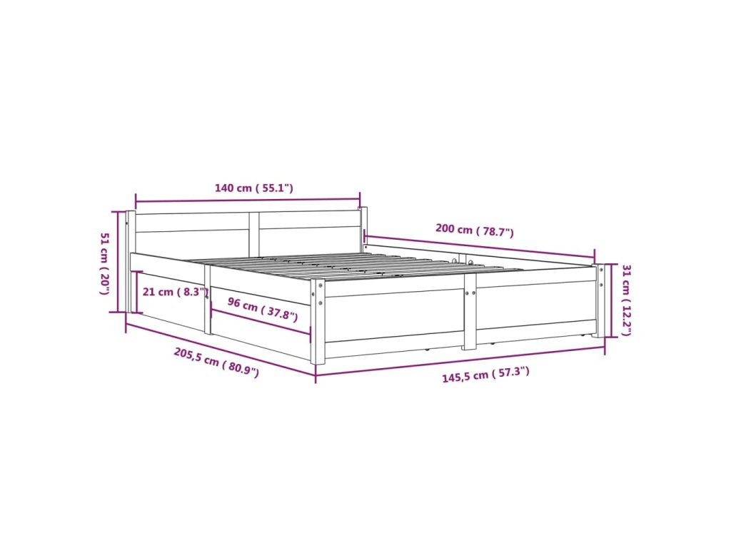 - Rozměry postele: 205,5 x 145,5 x 51 cm (D x Š x V)