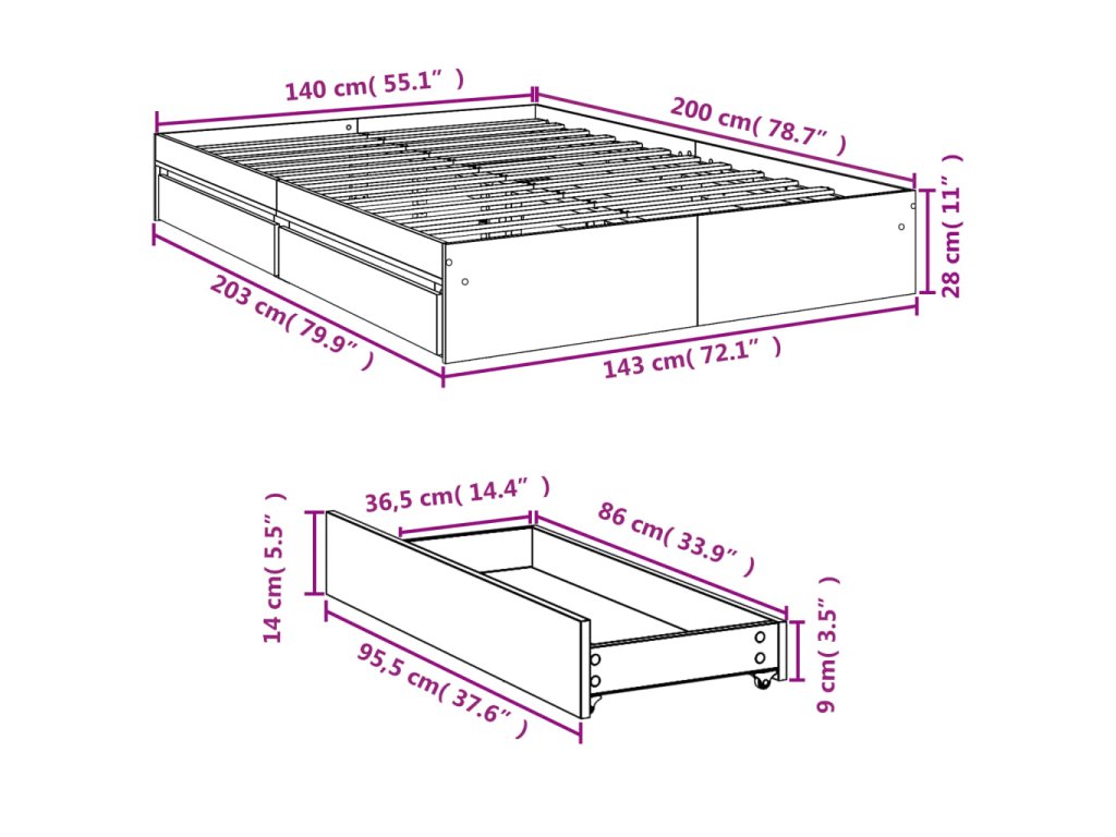- Rozměry zásuvky pod postel (každá): 95,5 x 36,5 x 14 cm (D x Š x V)