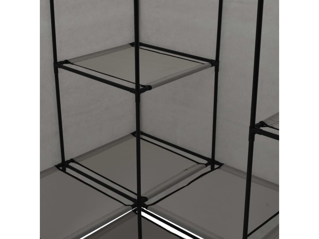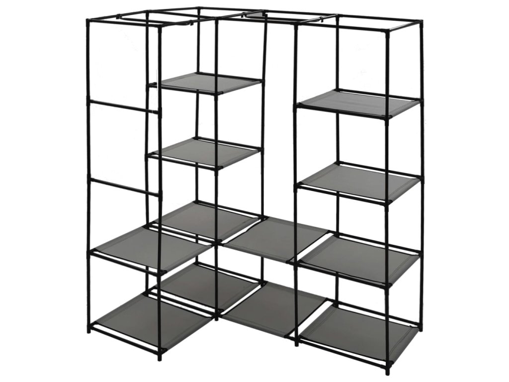 Tento stojan na oblečení s robustním železným rámem je mimořádně odolný. Ve srovnání s běžnou látkovou skříní je konstrukce rohové látkové skříně ještě stabilnější. Její design také šetří místo a umožňuje využít roh místnosti a vytvořit zde úložný prostor s tyčemi pro zavěšení, kde si můžete uspořádat vaše tašky, boty a malé předměty na dosah ruky. Textilní potah se zipy chrání vaše oblečení před nečistotami a prachem.