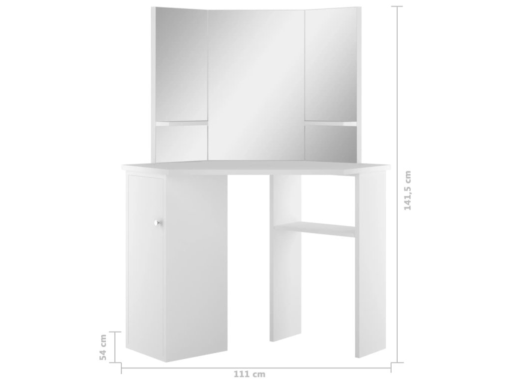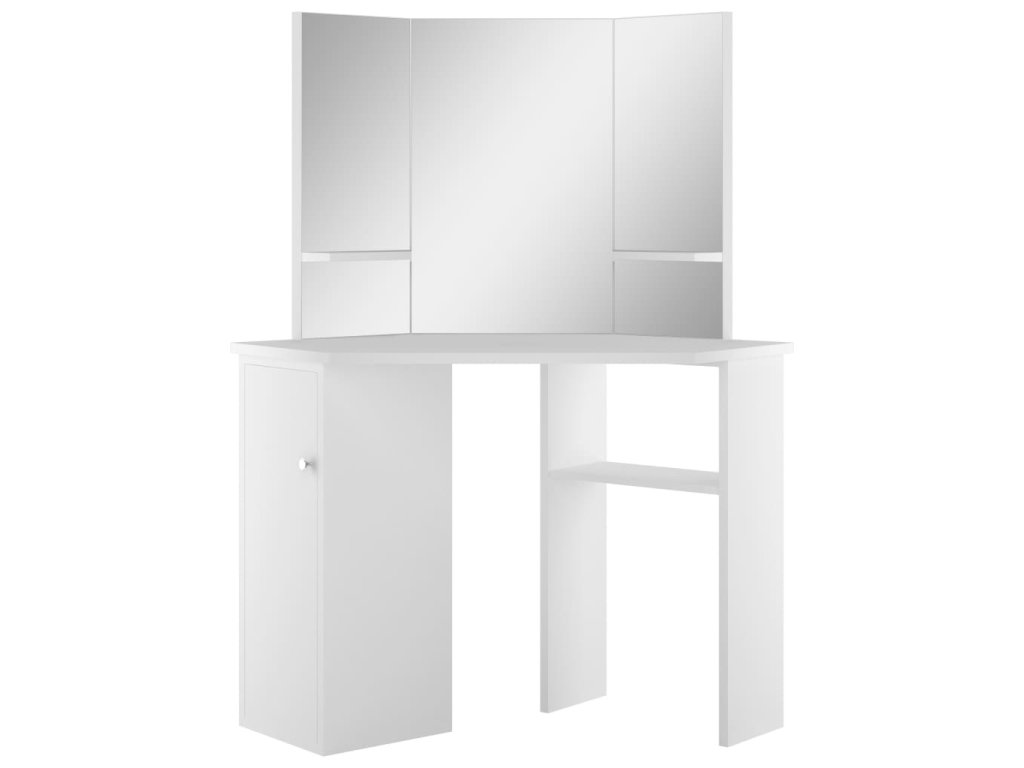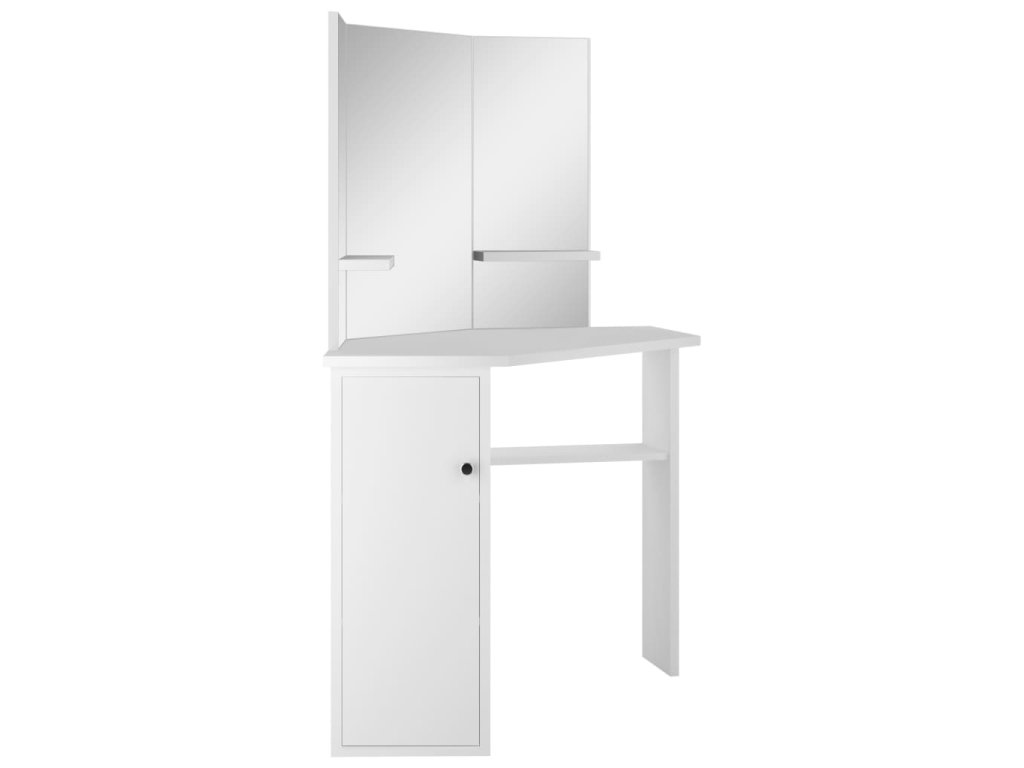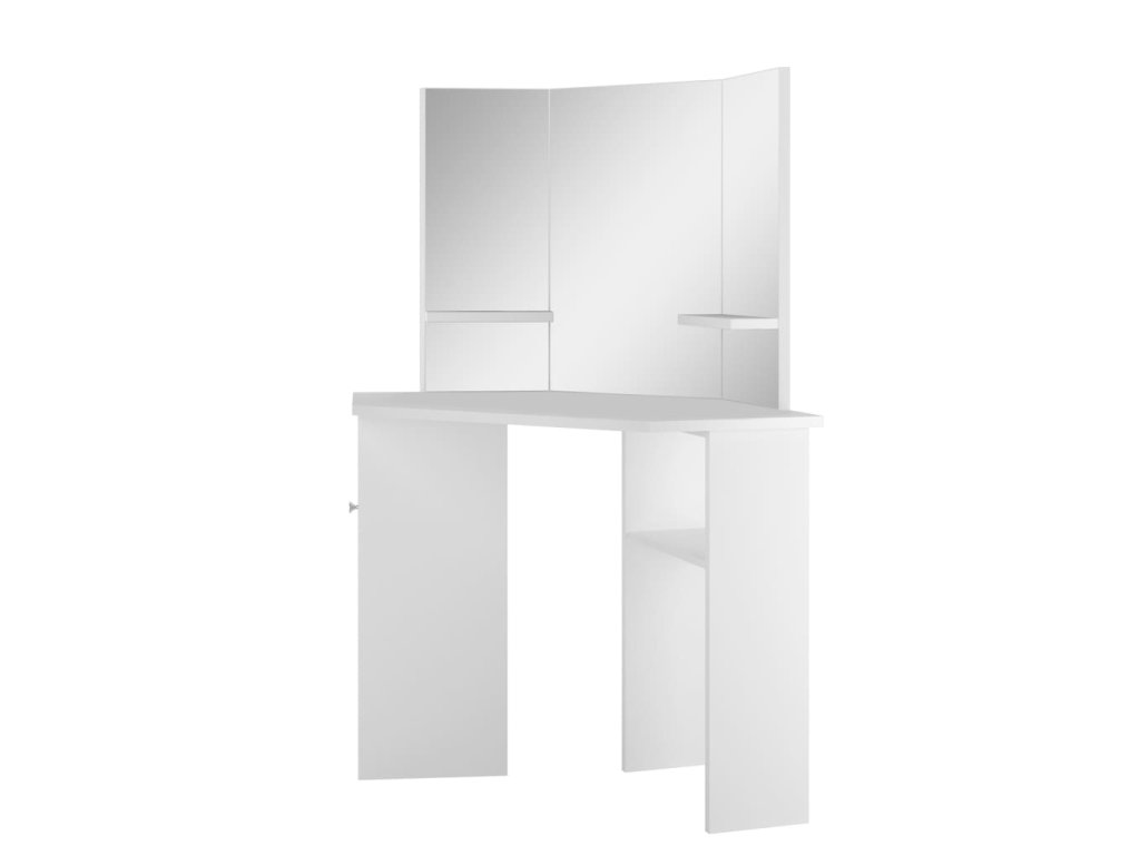 Tento toaletní stolek, vyrobený z kvalitního MDF, zaujme elegantní siluetou a jednoduchými liniemi v moderním stylu. Je navržen tak, aby se pohodlně vešel do rohu a zároveň nabídl na malém místě spoustu úložného místa! Prostorná skříňka a otevřená police pod stolní deskou slouží k přehlednému uložení líčení a kosmetiky, a jelikož jsou otevřené do stran, máte k nim snadný přístup, zatímco jste usazení u stolu. Krásné 3panelové zrcadlo vás odráží ze 3 stran, takže vám usnadňuje aplikaci make-upu a zároveň dodává stolu elegantní vzhled. Ke dvěma panelům jsou přidané spodní police na lahvičky, štětce na líčení, krémy a lotions, parfémy a dekorativní předměty.