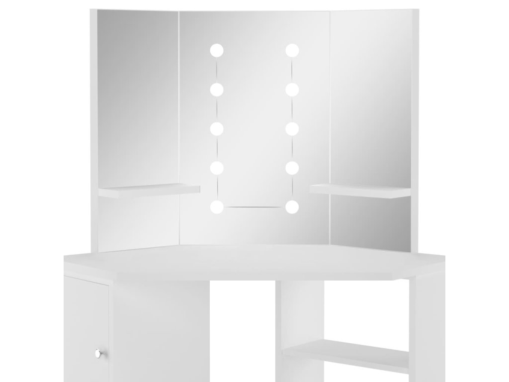 Tento toaletní stolek, vyrobený z kvalitního MDF, zaujme elegantní siluetou a jednoduchými liniemi v moderním stylu. Je navržen tak, aby se pohodlně vešel do rohu a zároveň nabídl na malém místě spoustu úložného místa! Prostorná skříňka a otevřená police pod stolní deskou slouží k přehlednému uložení líčení a kosmetiky, a jelikož jsou otevřené do stran, máte k nim snadný přístup, zatímco jste usazení u stolu. Krásné 3panelové zrcadlo vás odráží ze 3 stran, takže vám usnadňuje aplikaci make-upu a zároveň dodává stolu elegantní vzhled. Ke dvěma panelům jsou přidané spodní police na lahvičky, štětce na líčení, krémy a lotions, parfémy a dekorativní předměty. Elegantní LED žárovky vám poskytnou optimální osvětlení.