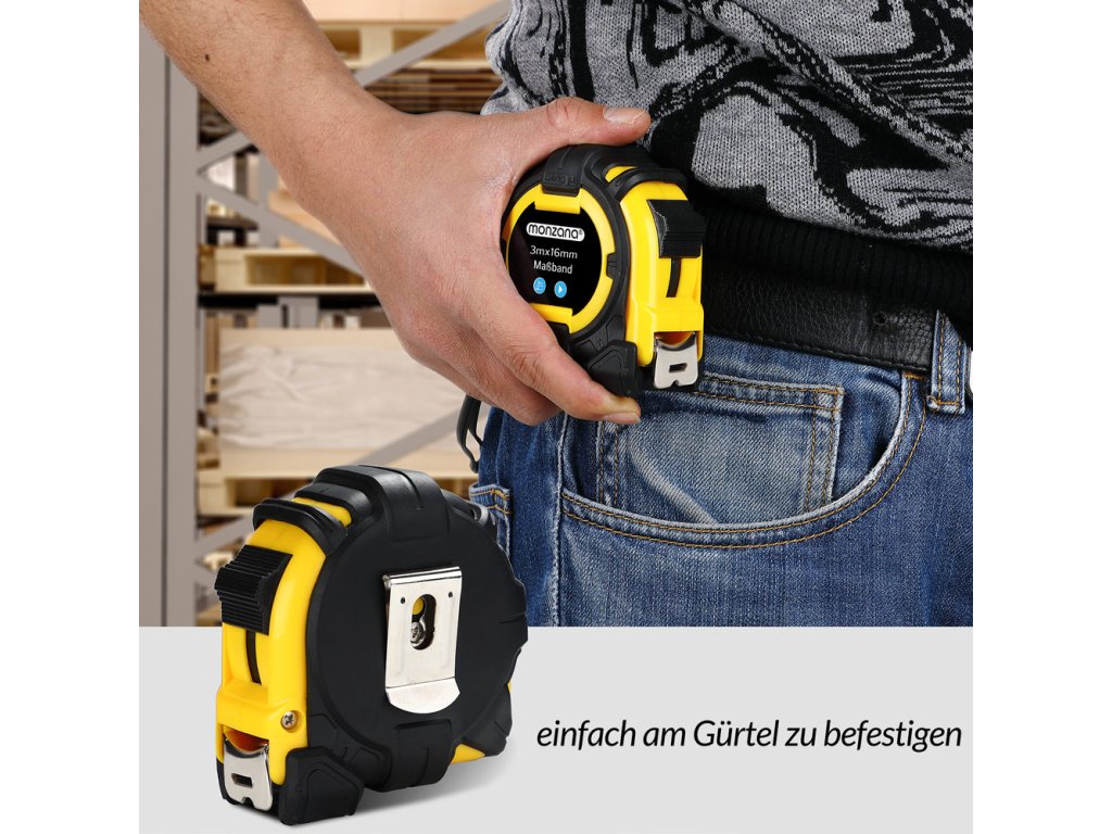 Praktická aretace udrží pásmo v požadované poloze, zatímco automatický naviják zajistí plynulé a bezpečné navinutí. Tříbodově nýtovaný koncový háček umožňuje přesné měření jak z vnější, tak vnitřní strany.