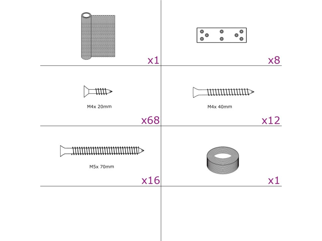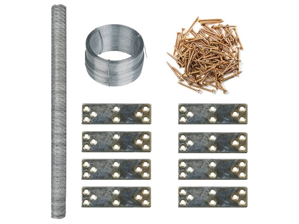 - Dodávka obsahuje pouze roli drátěného pletiva, vázací drát, ploché spojky a vruty do dřeva.