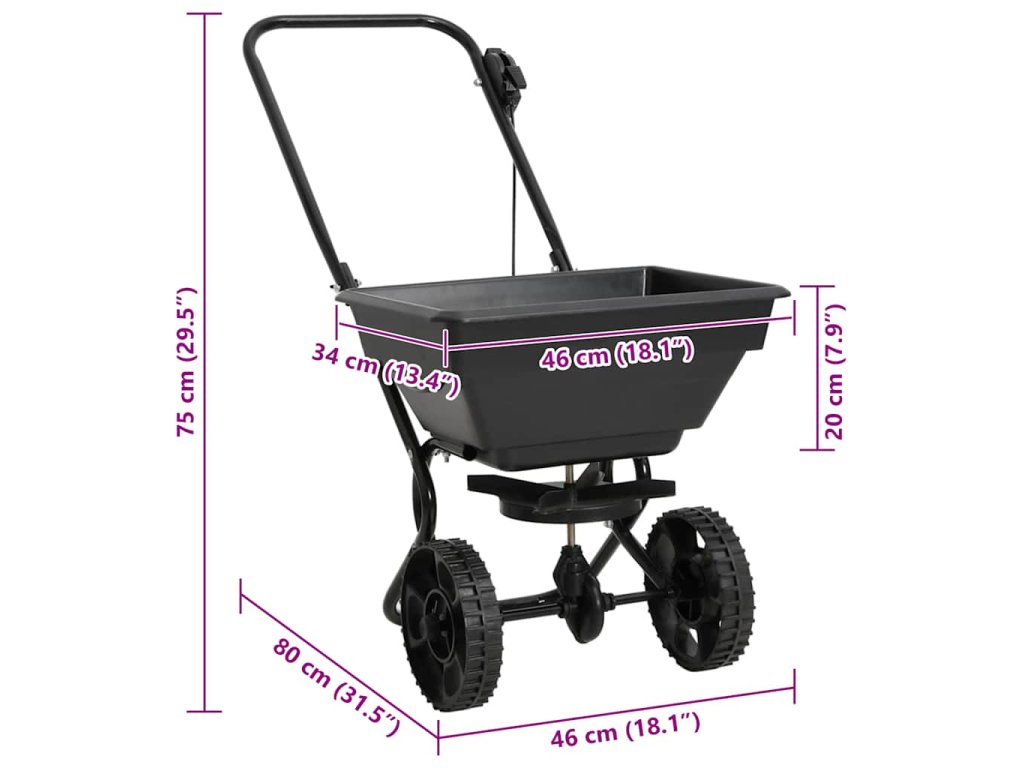 Robustní rozmetadlo má trubkový ocelový rám, který je odolný vůči korozi a jen tak se nepoškodí. Disponuje rovněž velkou násypkou z PVC, kterou můžete naplnit solí, semeny či hnojivem. Zahradní zametadlo je navrženo tak, aby přesně trefilo rovnováhu mezi rozprašováním příliš velkého či příliš malého množství travního osiva, ani moc hustě ani moc řídce, tak, aby umožnilo zdraví růst trávy. Pomáhá také rovnoměrně roznášet trávníkové hnojivo, aby se snížilo riziko spálení. Rozmetadlo na trávník je dodáváno s kabelově ovládaným ovladačem na rukojeti, takže můžete snadno nastavovat rychlost rozptylu pro větší účinnost. Součástí designu jsou dvě kola a dlouhá rukojeť, jež vám umožní s tímto nástrojem snadno manipulovat ve větší zahradě.