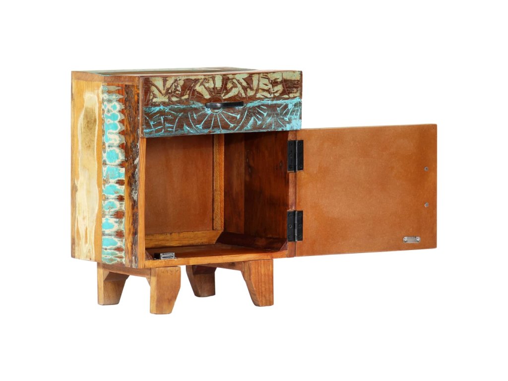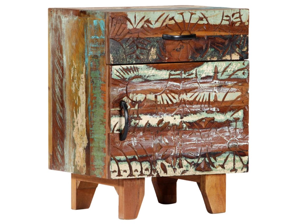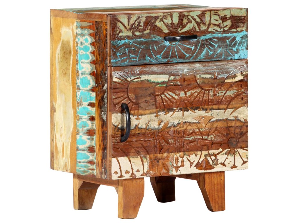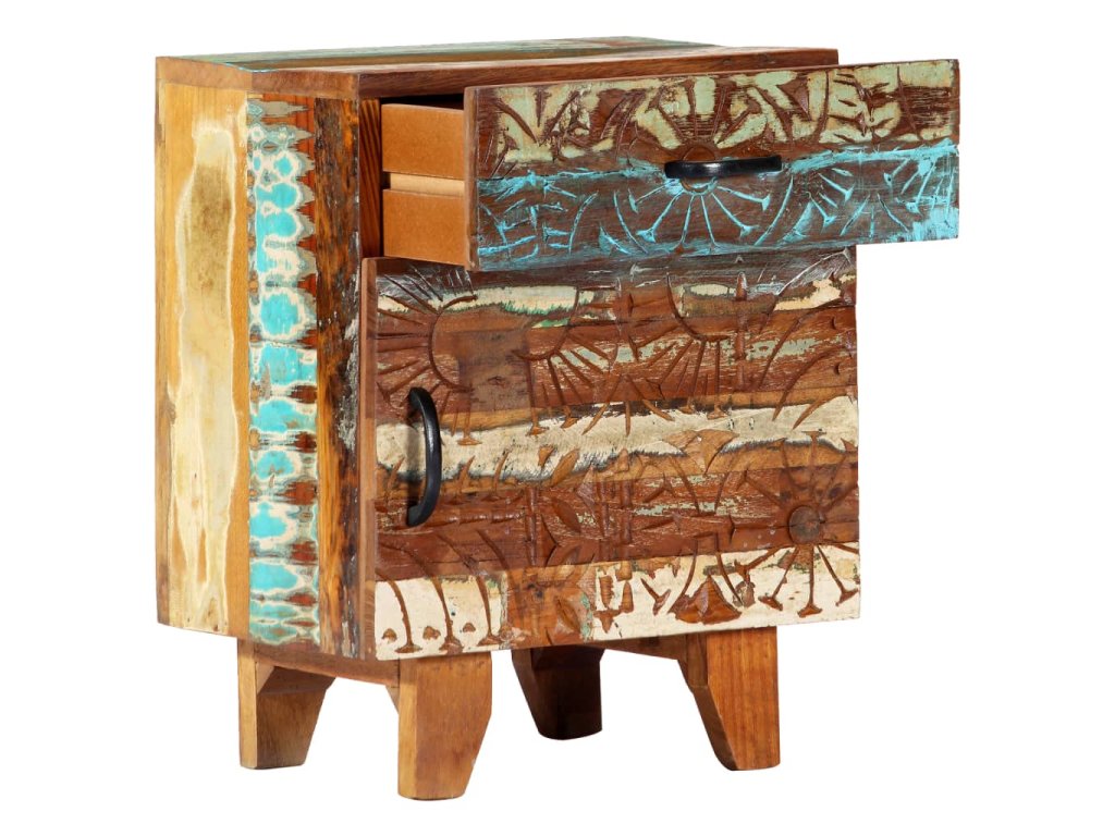 Barevný noční stolek se starožitným vyřezávaným zdobením je vyrobený z masivního recyklovaného dřeva, které pochází z trámů, podlah a podpěrných nosníků ze starých budov určených k demolici. Obsahuje tedy celou řadu různých druhů dřeva, jako jsou borovice, teak, buk, dub, cedr, mangovník, akácie atd. Recyklované dřevo tak nabývá vlastností všech těchto rozličných typů dřevin. Navíc je již zestárlé, zvětralé a vyschlé, takže se nesmršťuje ani neohýbá. Každá fáze výrobního procesu je prováděná s mimořádnou péčí, ať už se jedná o natírání, leštění nebo lakování. Prvotřídní řemeslné zpracování a elegantní kresba dřeva činí každý kus nábytku jedinečným a lehce odlišným od ostatních. Ve vintage skříňce k posteli najdete 1 zásuvku a 1 přihrádku s dvířky, které představují ideální řešení k uložení menších předmětů organizovaně a zároveň po ruce. Sestavení nočního stolku je jednoduché.