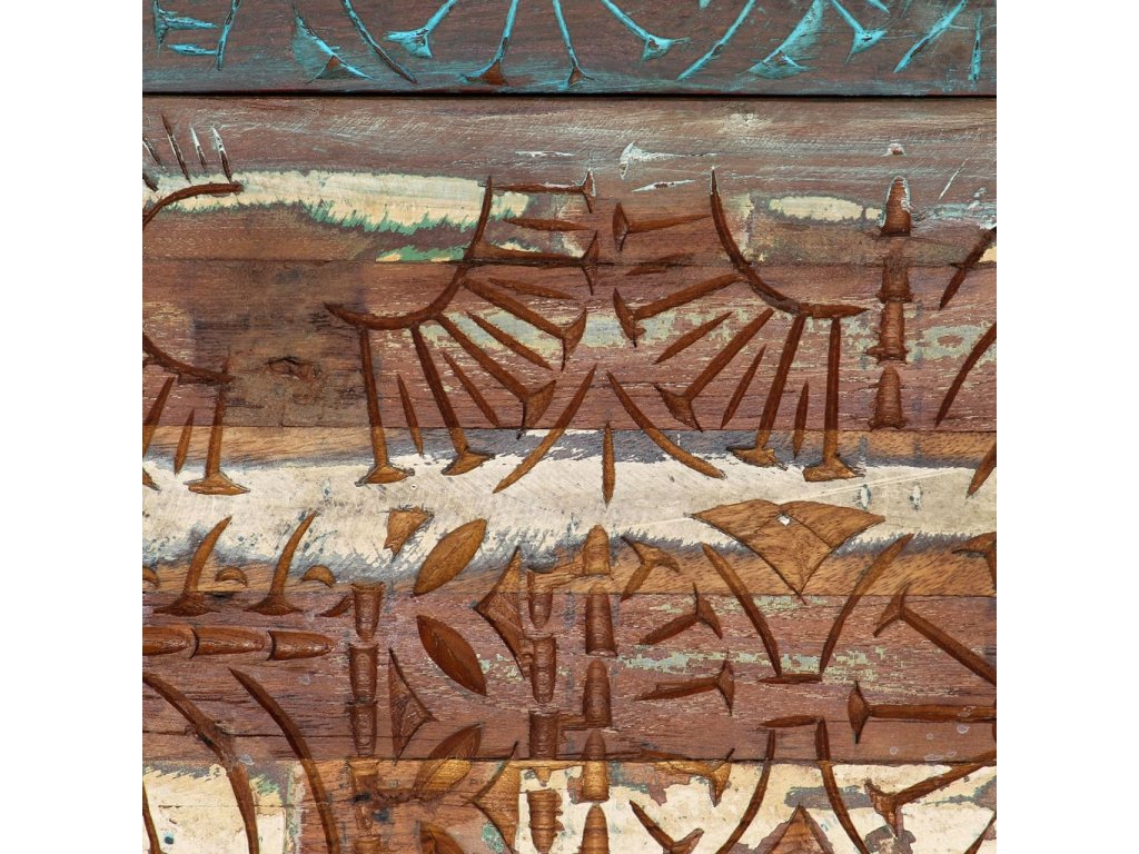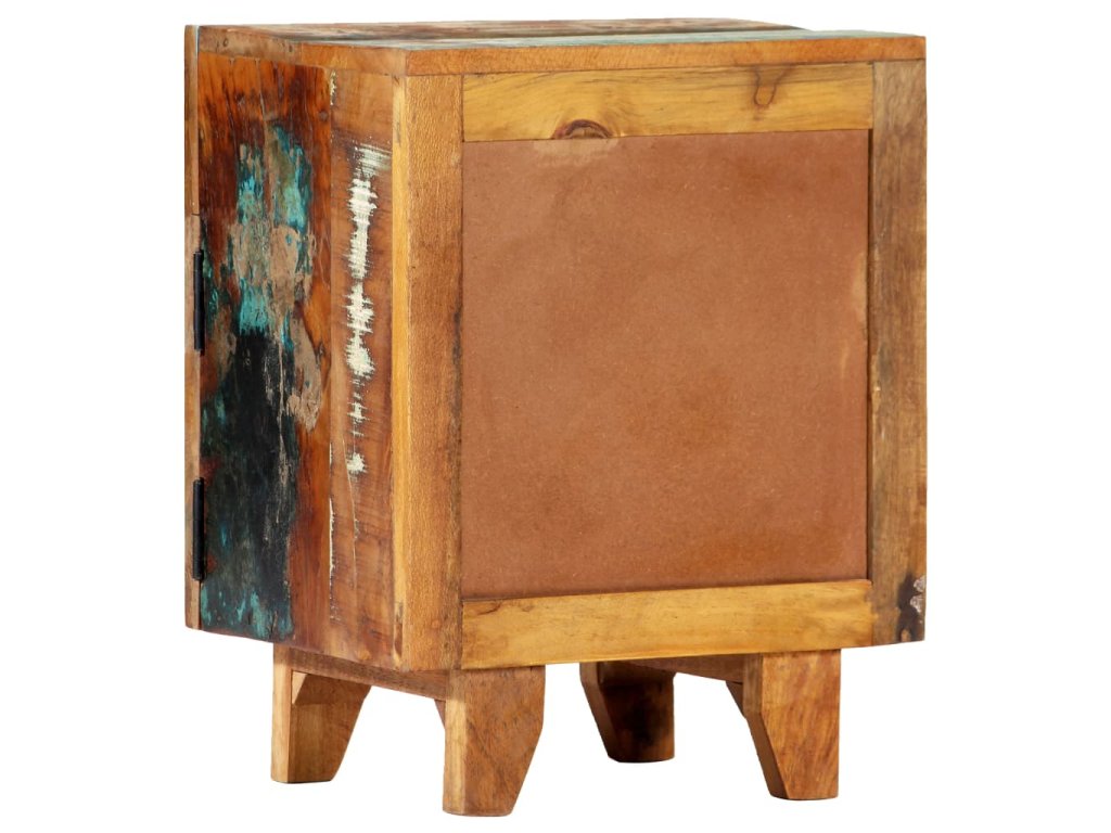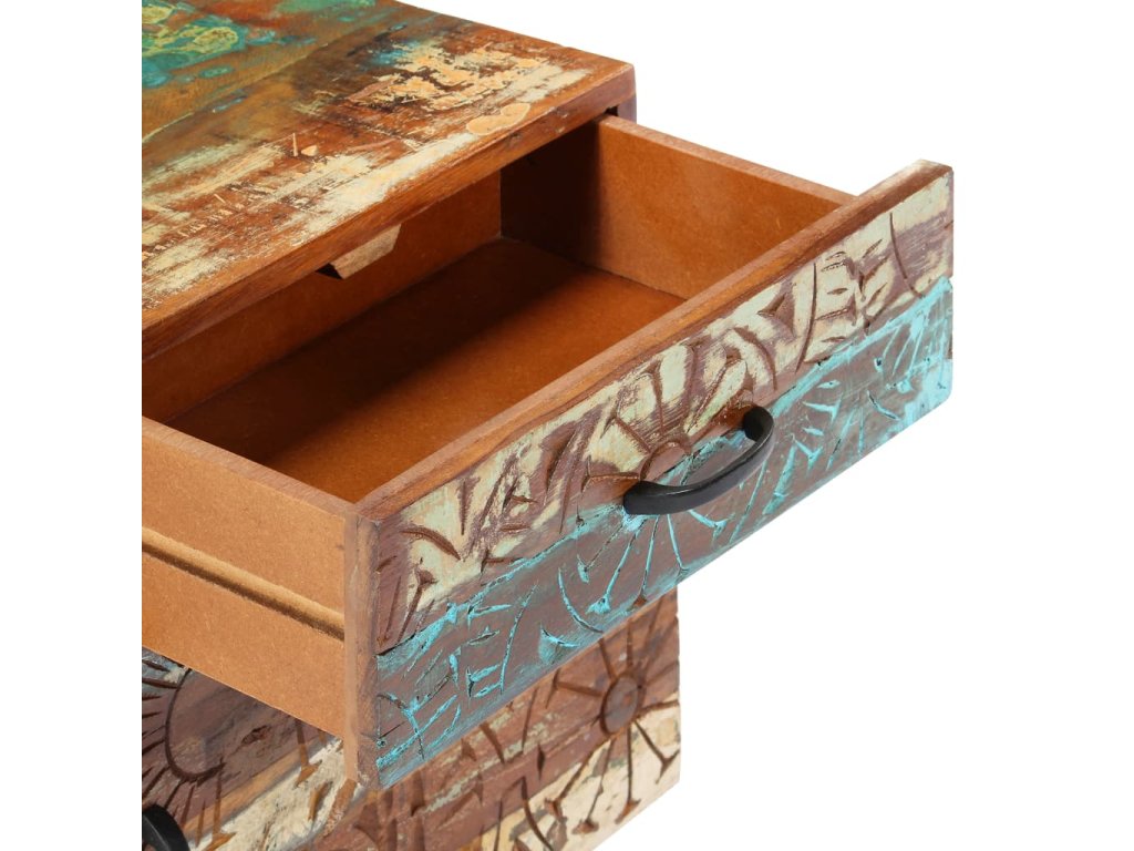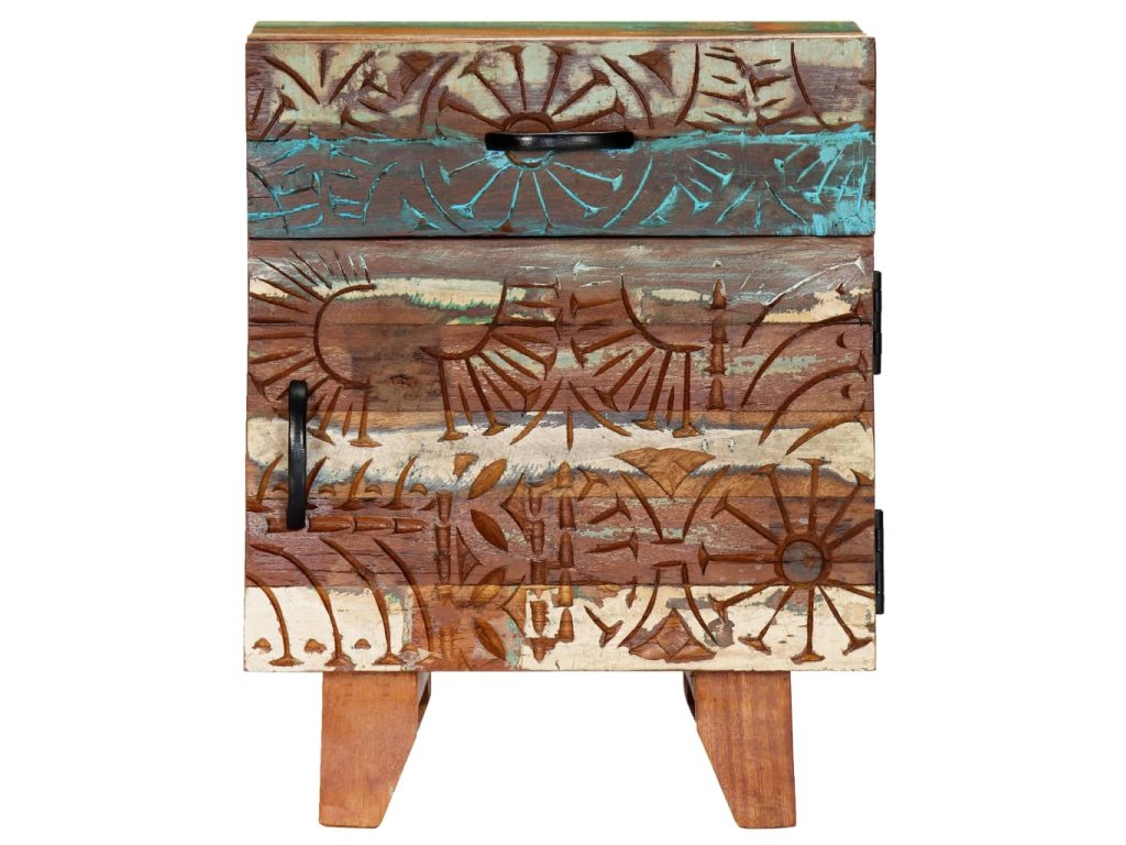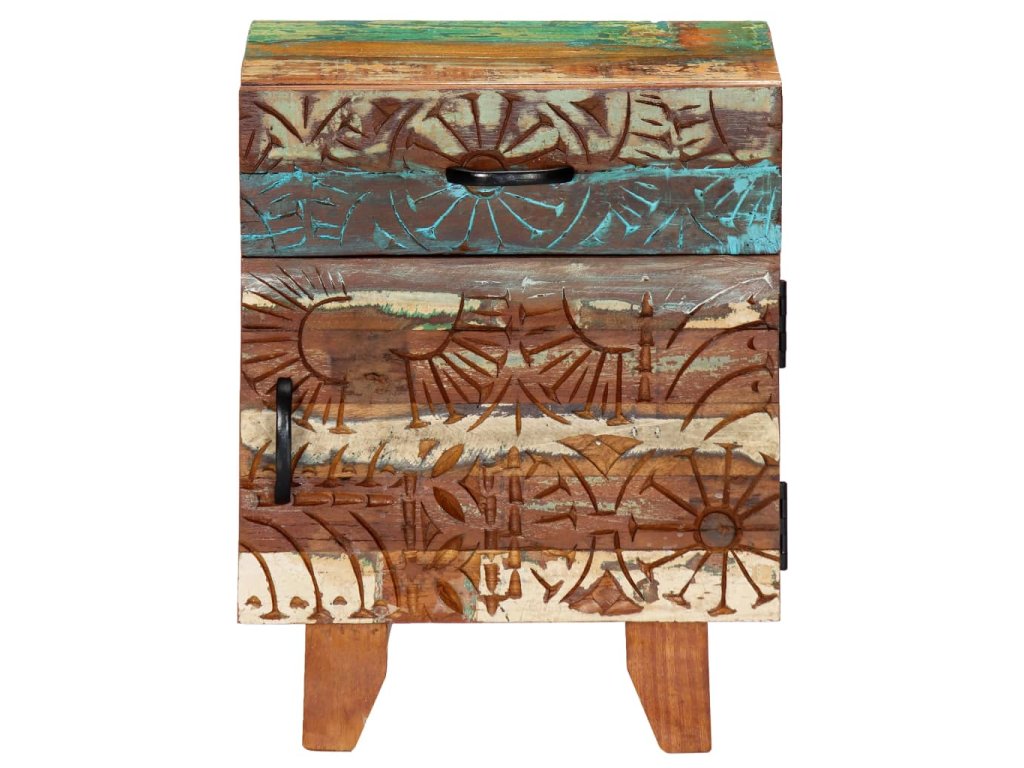 Barevný noční stolek se starožitným vyřezávaným zdobením je vyrobený z masivního recyklovaného dřeva, které pochází z trámů, podlah a podpěrných nosníků ze starých budov určených k demolici. Obsahuje tedy celou řadu různých druhů dřeva, jako jsou borovice, teak, buk, dub, cedr, mangovník, akácie atd. Recyklované dřevo tak nabývá vlastností všech těchto rozličných typů dřevin. Navíc je již zestárlé, zvětralé a vyschlé, takže se nesmršťuje ani neohýbá. Každá fáze výrobního procesu je prováděná s mimořádnou péčí, ať už se jedná o natírání, leštění nebo lakování. Prvotřídní řemeslné zpracování a elegantní kresba dřeva činí každý kus nábytku jedinečným a lehce odlišným od ostatních. Ve vintage skříňce k posteli najdete 1 zásuvku a 1 přihrádku s dvířky, které představují ideální řešení k uložení menších předmětů organizovaně a zároveň po ruce. Sestavení nočního stolku je jednoduché.