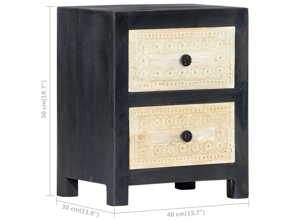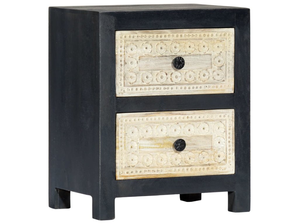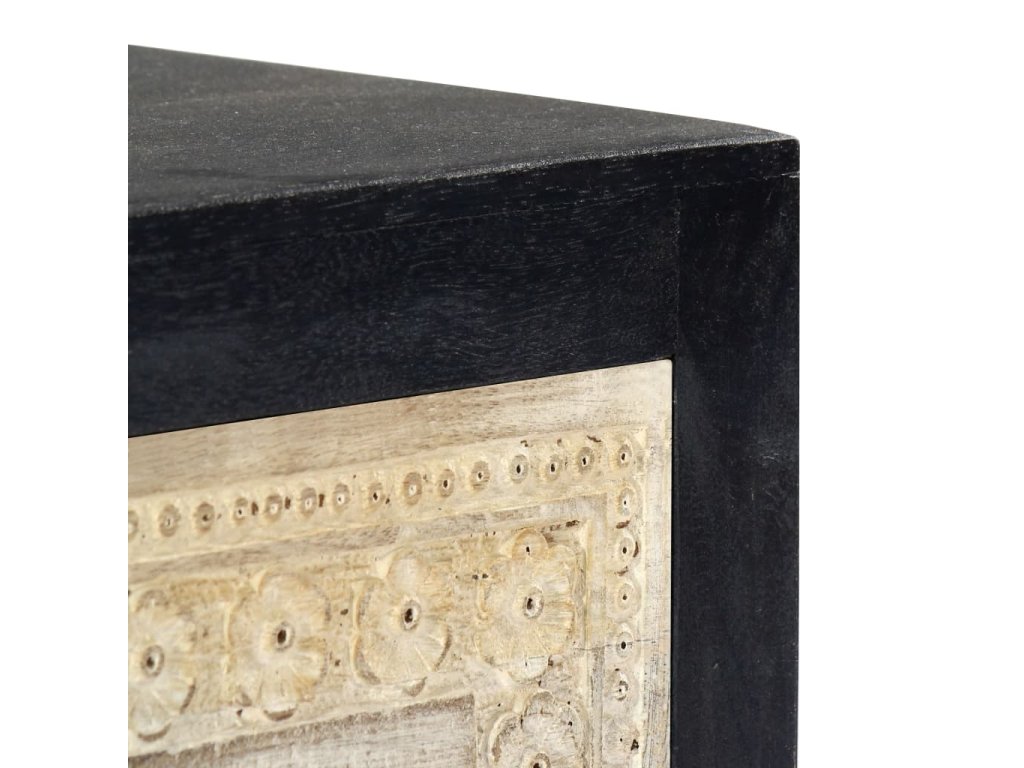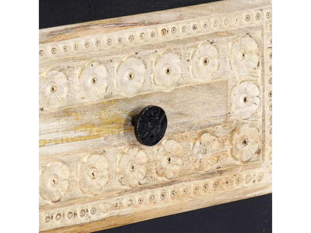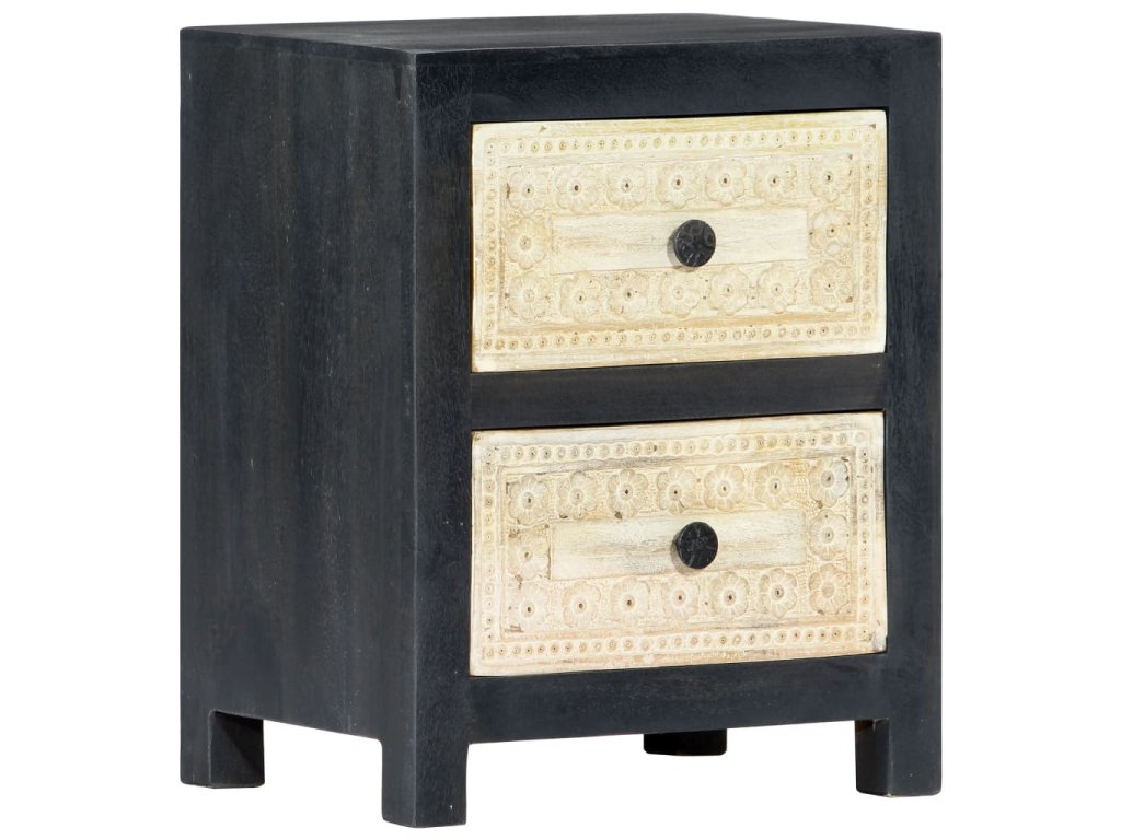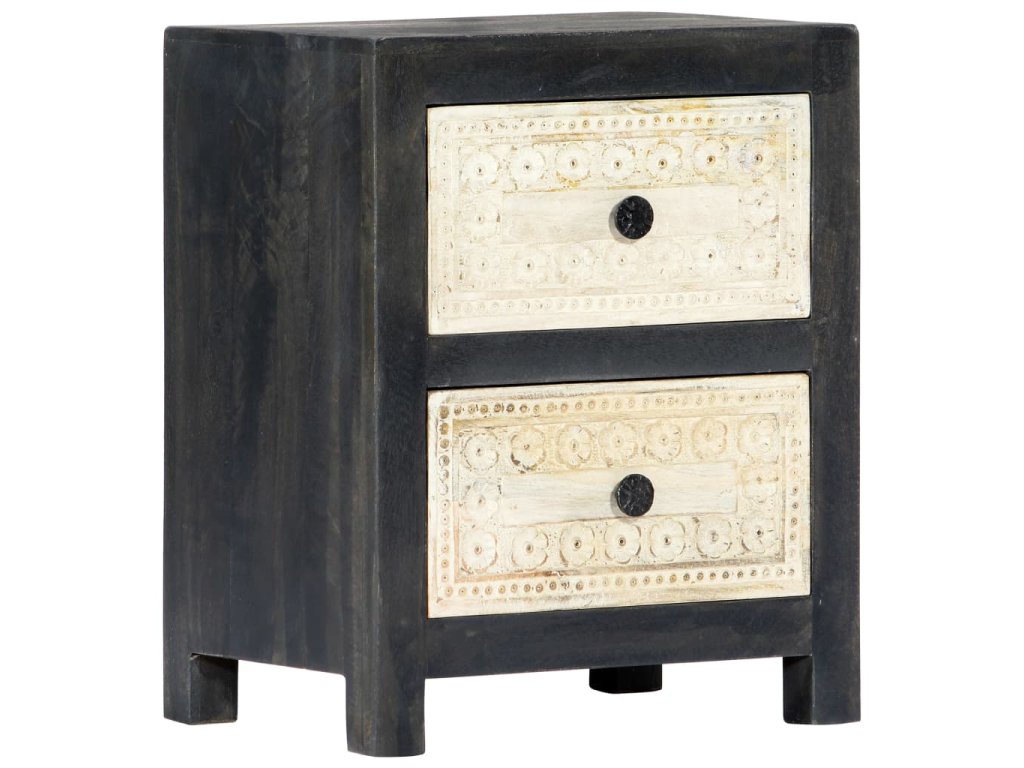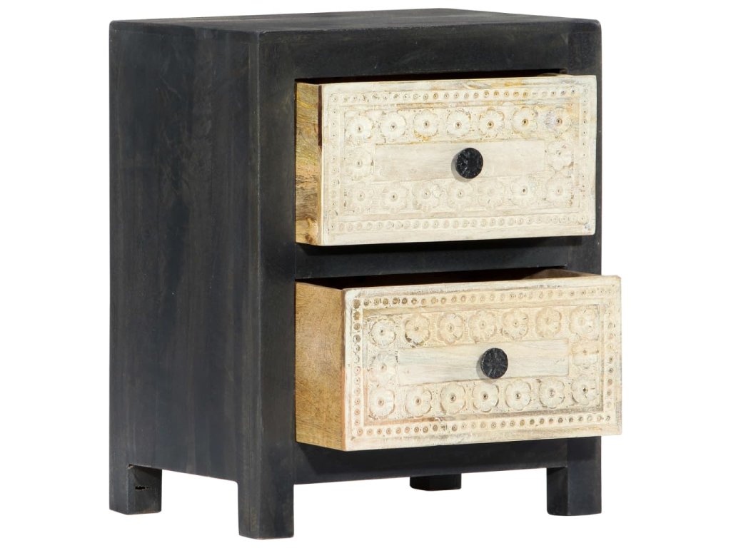 Noční stolek je vyrobený z masivního mangovníkového dřeva a byl naleštěn, natřen a nalakován, čemuž vděčí za svůj půvabný a rafinovaný vzhled. Dvě zásuvky s ručně vyřezávaným motivem dodávají noční skříňce na kráse a zároveň poskytují dostatek úložného prostoru pro přehledné uschování vašich drobností, které tak budete mít neustále po ruce. Sestavení skříňky je jednoduché a k jejímu čištění vám postačí vlhký hadřík.