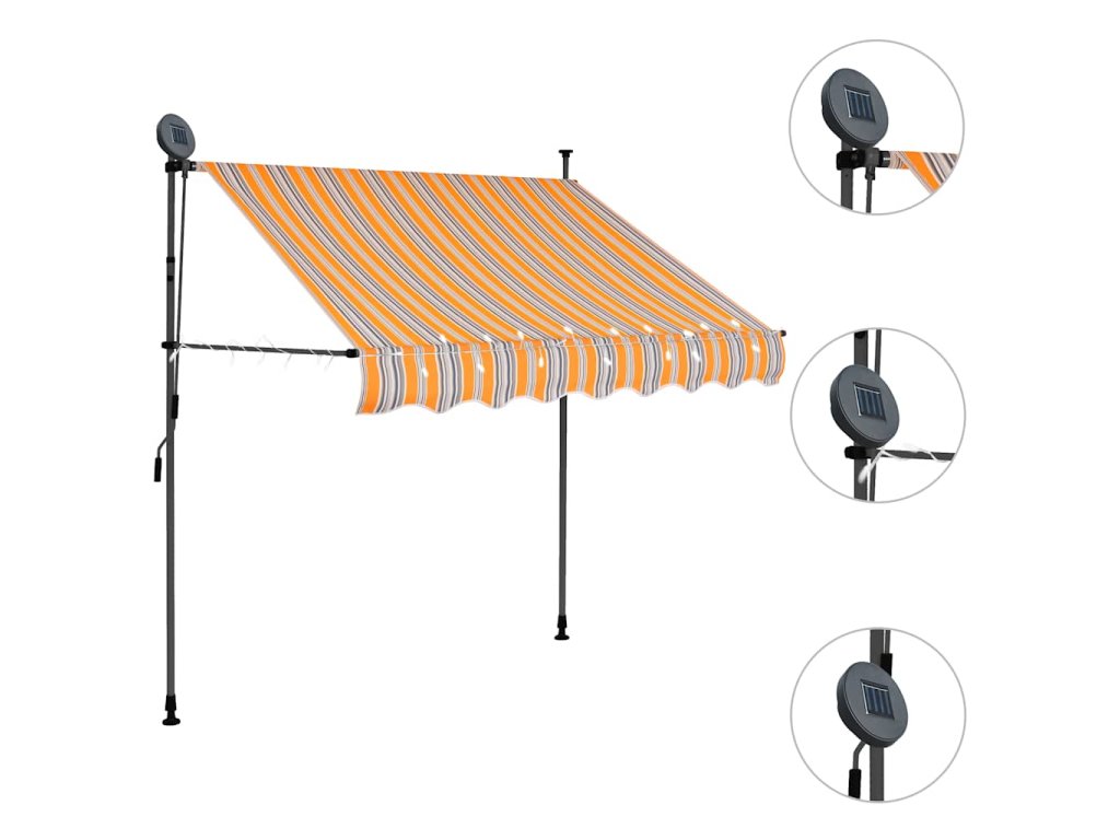 Markýza je vyrobená z kvalitního polyesteru potaženého vrstvou PU, a proto odpuzuje vodu i špínu a výborně vzdoruje klimatickým vlivům a UV záření. Silný ocelový rám jí dodává na pevnosti a prodlužuje její životnost. Polyesterová stříška se snadno čistí, lze ji totiž sejmout a oprat. Markýzu je možné zatahovat a roztahovat pomocí ruční kliky. Nastavit můžete i její výšku a sklon. Solárně napájená LED světla vám navíc v noci poskytnou osvětlení. Sestavení markýzy je jednoduché.
