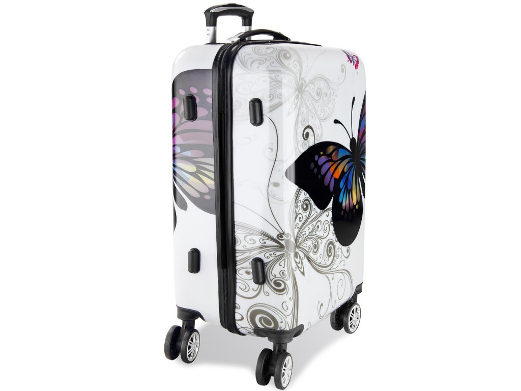 Odolný kufr Butterfly z polykarbonátu s tichými kolečky, vnitřním organizérem a číselným zámkem. Stylový, lehký a ideální na víkendové cesty.