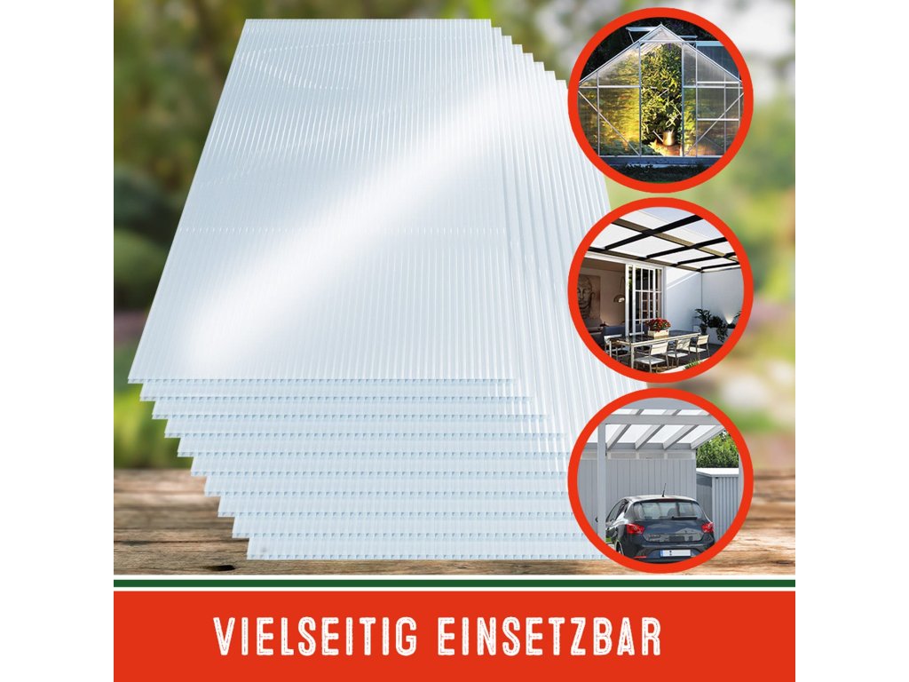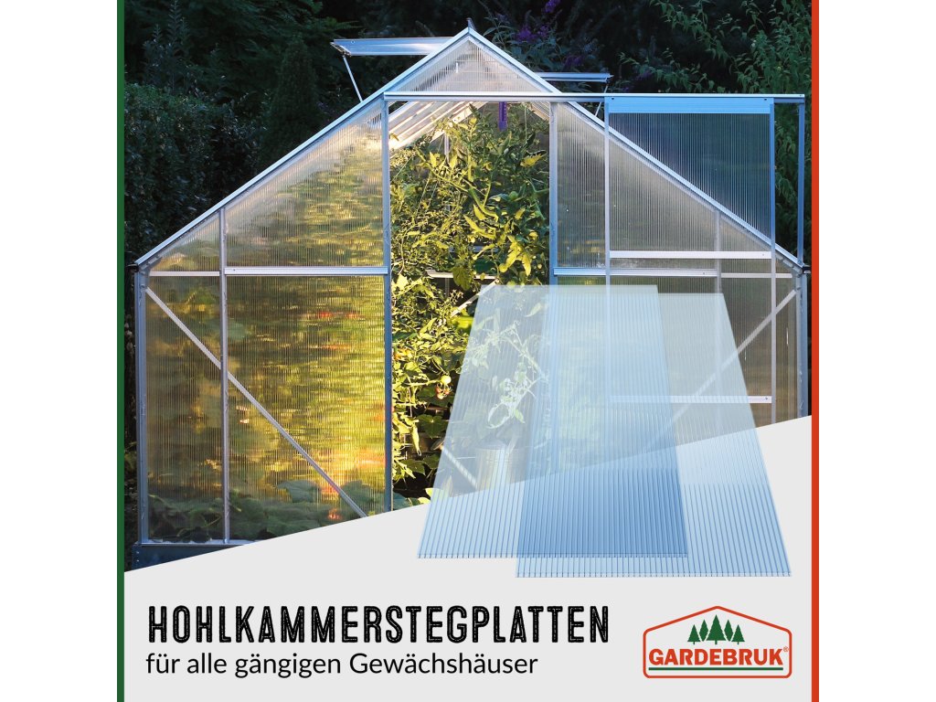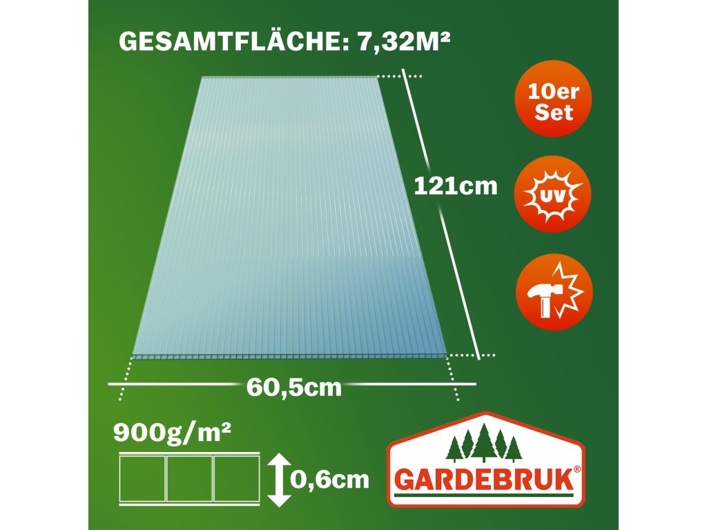 Potřebujete opravit skleník, postavit nové pařeniště nebo zastřešit pergolu? Tato sada 10 dutinkových polykarbonátových desek od Gardebruk® je ideální volbou. Díky formátu 60,5 × 121 cm a celkové ploše 7,32 m² jsou desky vhodné pro širokou škálu projektů – od zahradních staveb po terasová zastřešení.