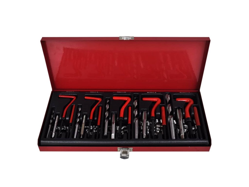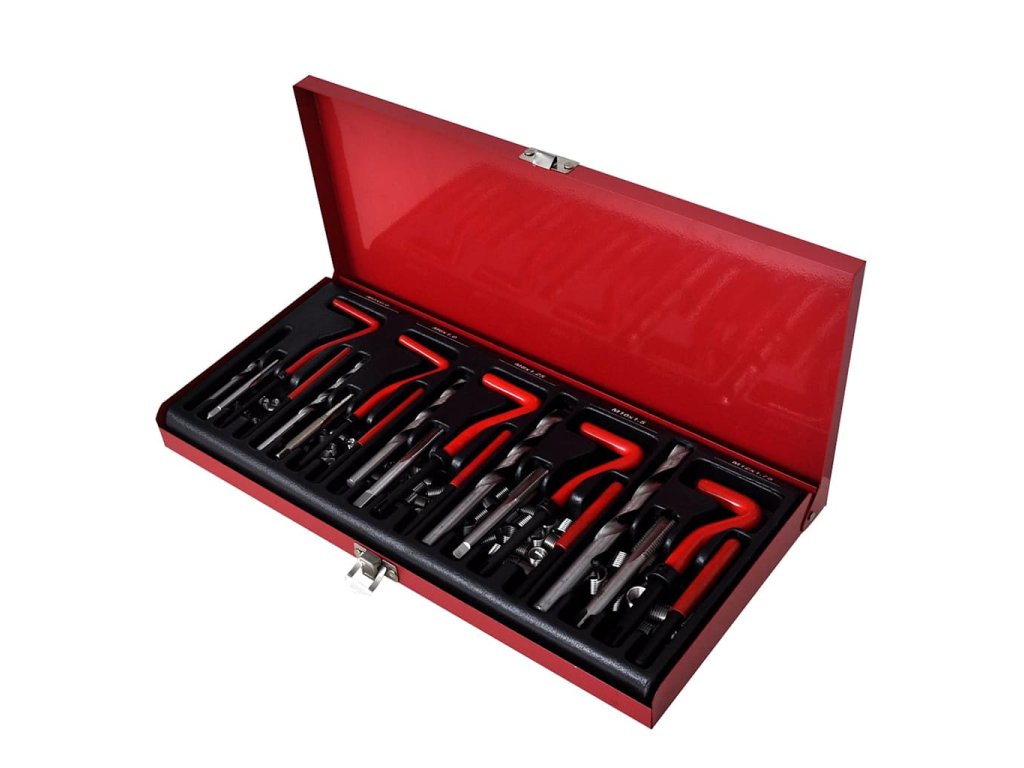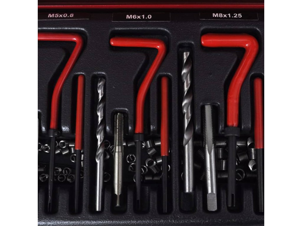 Tato sada na opravu závitů se používá na opravu nebo nahradu poškozených nebo rozebraných vnitřních závitů . Souprava má celkem 131 kusů , vše v souladu s profesionálními normami . Má jeden HSS Utahovák pro každou velikost , jeden HSS vrták pro každou velikost , 2 zasunovací nástroje pro každou velikost , závitové vložky pro každou velikost , a jsou dodávány v praktickém pouzdře . Dodávka zahrnuje 5x HSS vrták , 5x HSS Utahovák z oceli , 5x nástroj na vkládání , 5x tang brzda , a 110x ocelové závitové vložky v kufříku .
