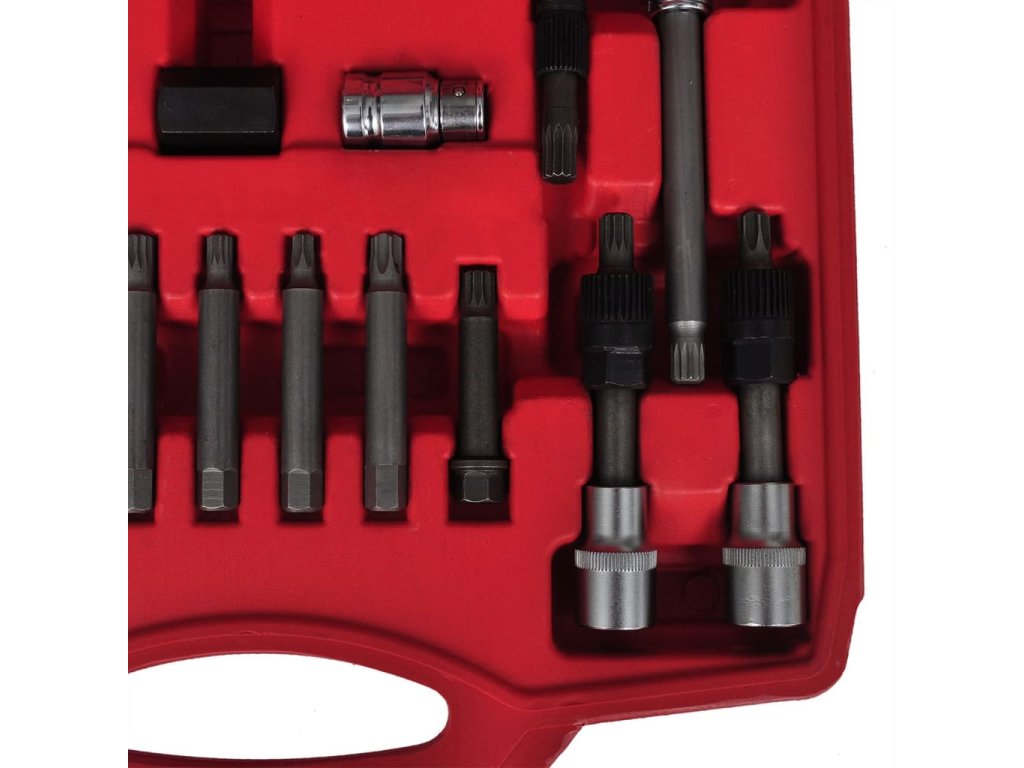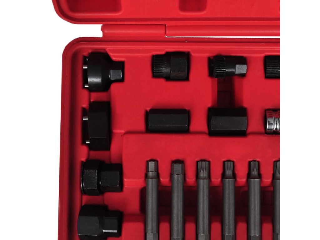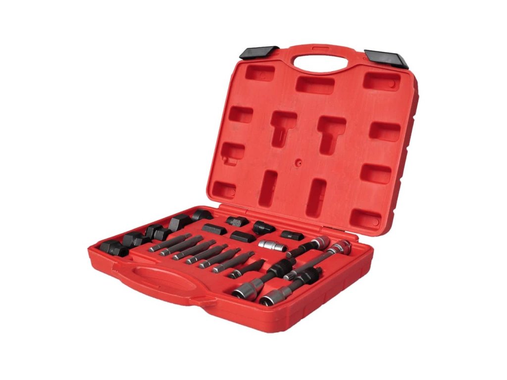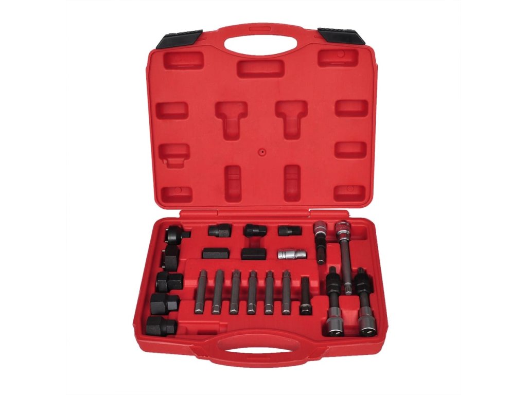 Tato sada na stahování řemenic alternátorů se skládá z 22 kusů profesionálních klíčů a adaptérů. S touto sadou si usnadníte montáž i demontáž řemenic alternátorů. Sada také umožňuje stabilizaci hřídele alternátoru při stahování řemenice.Tato sada na stahování řemenic alternátorů obsahuje různé adaptéry, takže je vhodná pro mnoho značek vozů. Obsahuje kompletní spektrum TRX-Star, drážkových bitů a imbusových bitů, které se hodí na většinu altetnátorů.