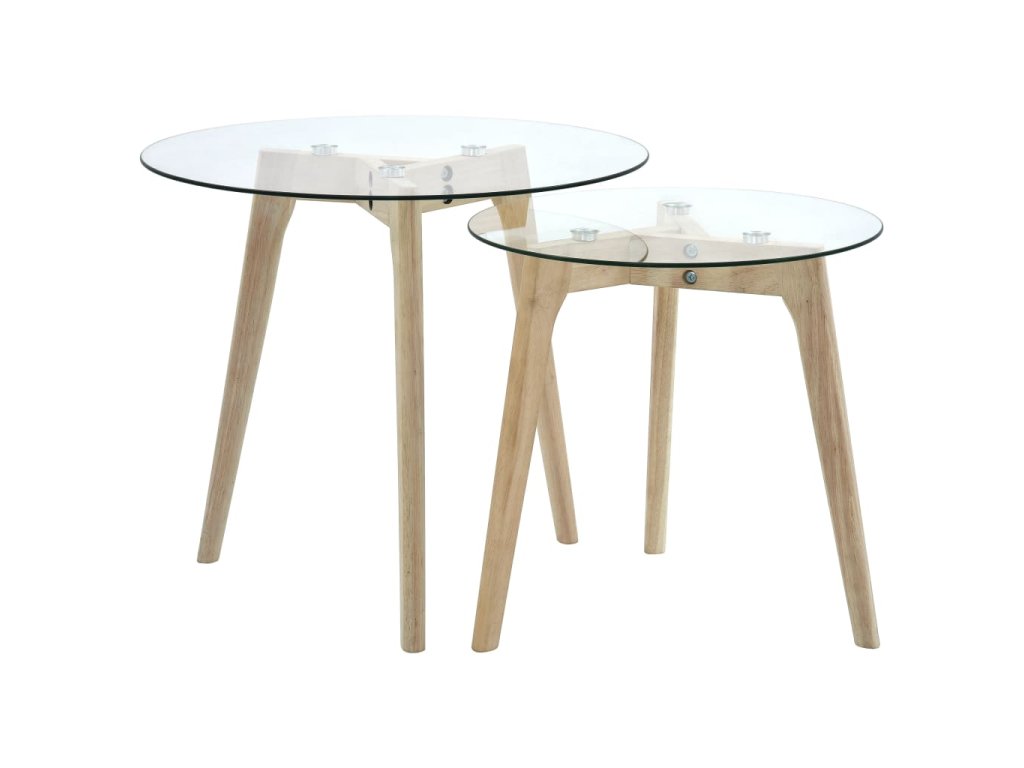 Stolní desky z tvrzeného skla jsou velmi pevné a hladké a snadno se čistí. Můžete si na ně postavit vázy s květinami, mísy s ovocem nebo si na ně odložit nápoje. Stolky podpírají masivní dubové nohy, které zaručují vysokou stabilitu a dlouhou životnost. Kompaktní rozměry a prostorově úsporný a lehký design, umožňují snadné přesouvání a přenášení. Sada stolků vám poslouží doma i v kanceláři, například jako jídelní stůl, konferenční stolek nebo stolek na čtení.
