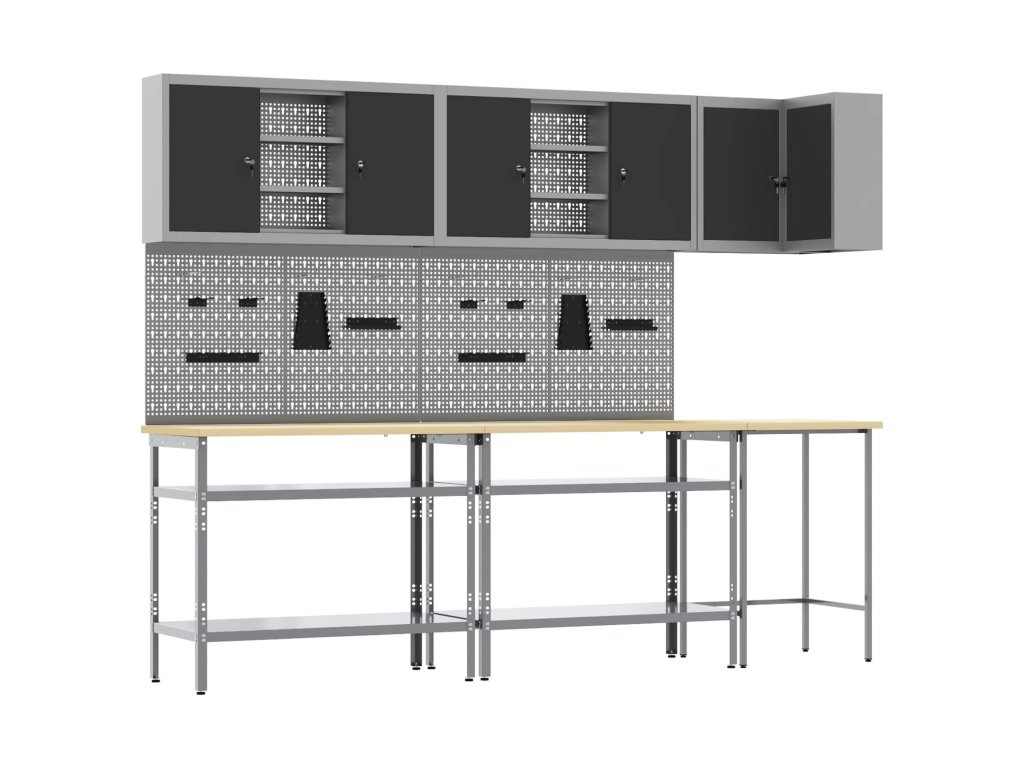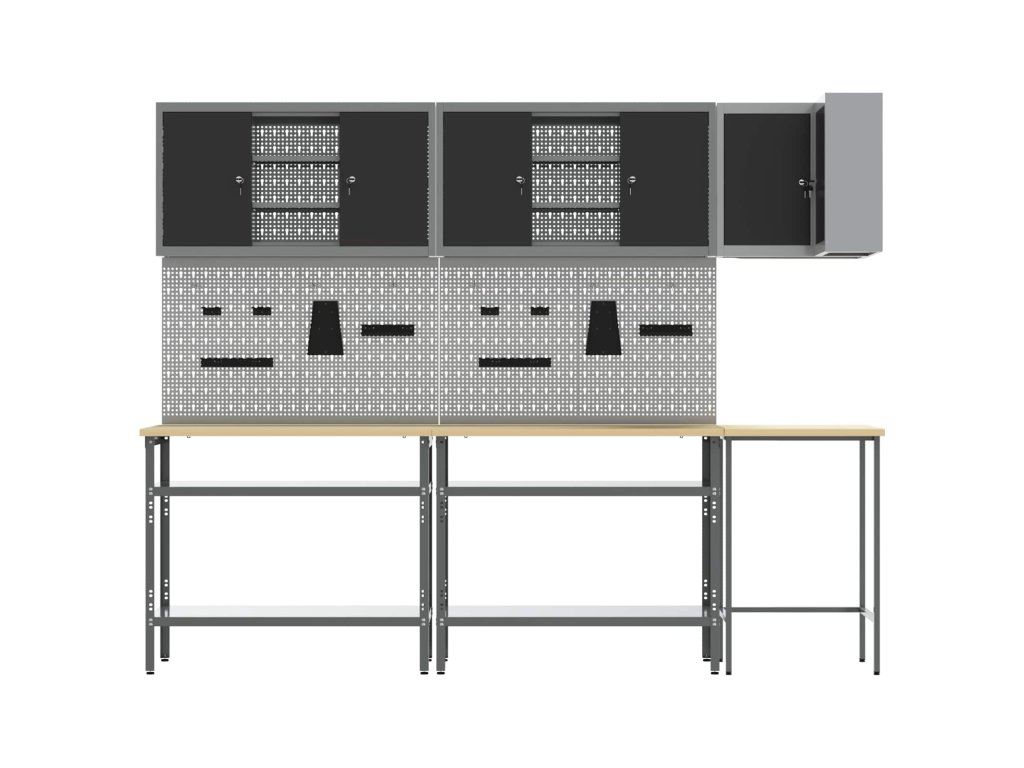 - Materiály: Skříňka je vyrobená z práškově lakované oceli a kompozitního dřeva, takže je robustní a dlouhotrvající pro skladování nářadí. Tyto materiály jsou vybrané pro svou pevnost a odolnost, což prodlužuje její životnost. Práškový povrch je odolný proti opotřebení, takže vydrží dlouho.