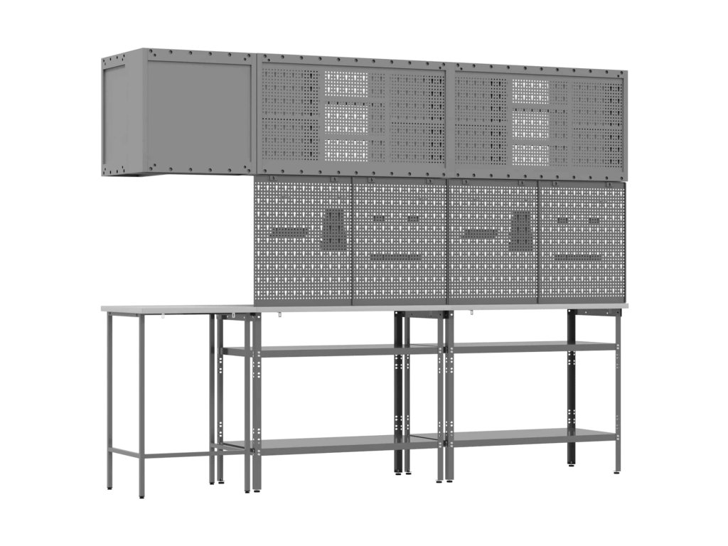- Funkce / Design: Její moderní design se zaměřuje na jednoduchost a funkčnost, takže se snadno vejde do různých stylů dílen. Čisté linie a minimální ozdoby dávají skříňce sofistikovaný vzhled a praktický prostor na ukládání nářadí. Nastavitelné nohy umožňují přizpůsobení podle vašich potřeb.