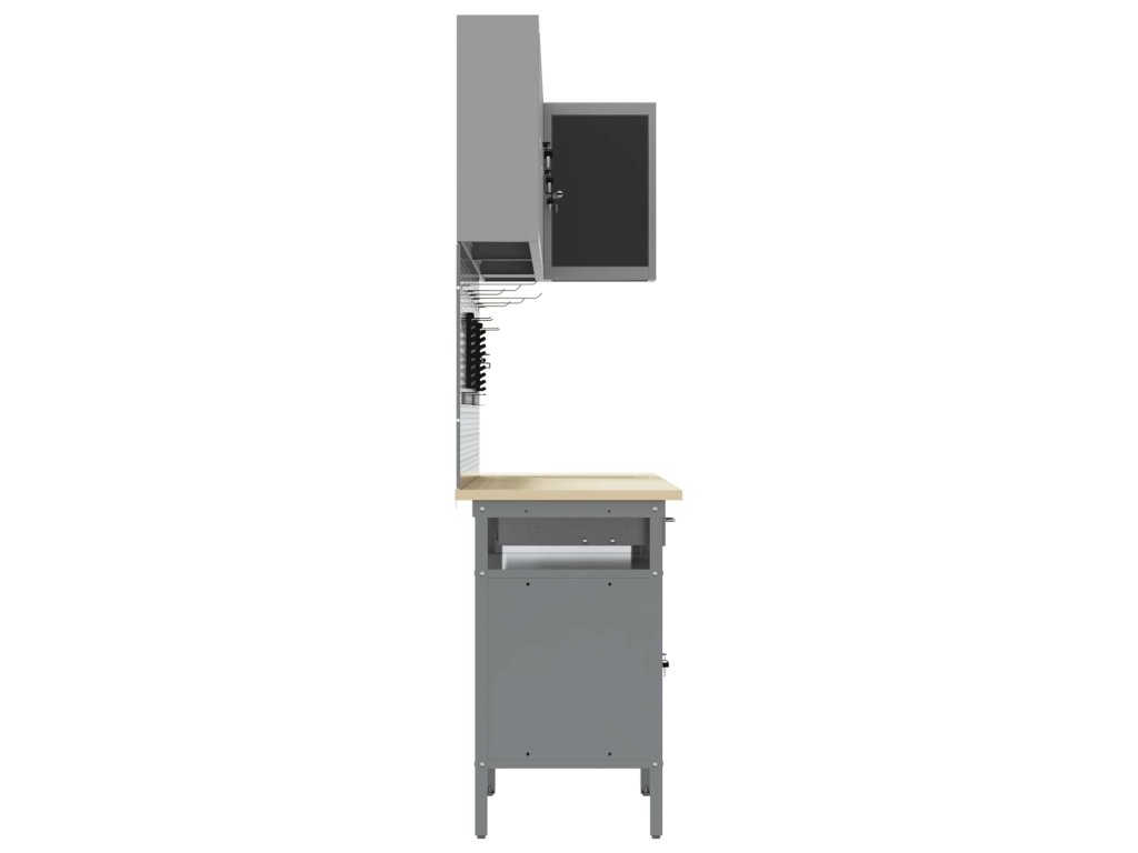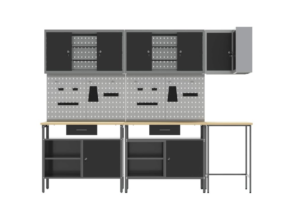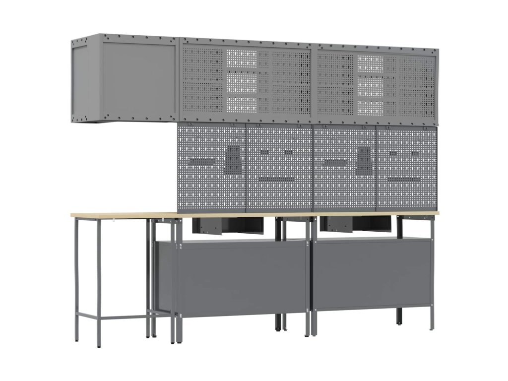 - Materiály: Skříňka je vyrobená z práškově lakované oceli a kompozitního dřeva, takže je robustní a dlouhotrvající pro skladování nářadí. Tyto materiály jsou vybrané pro svou pevnost a odolnost, což prodlužuje její životnost. Práškový povrch je odolný proti opotřebení, takže vydrží dlouho.