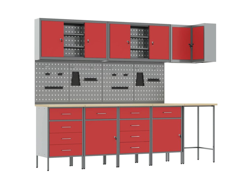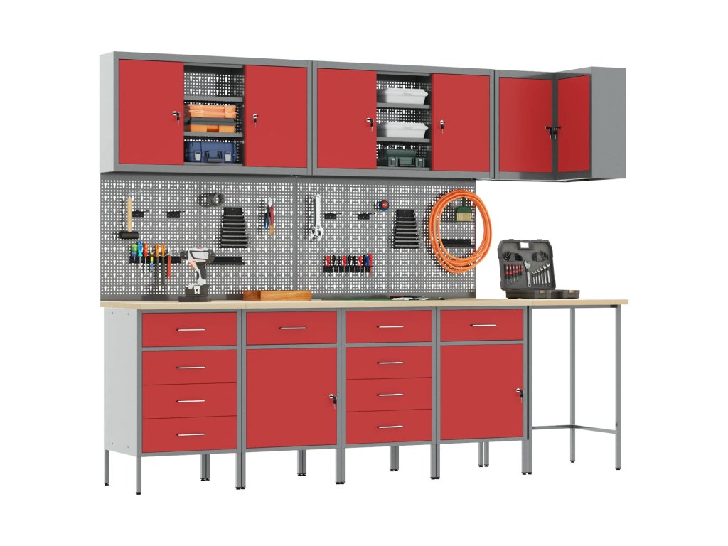- Materiály: Skříňka je vyrobená z práškově lakované oceli a kompozitního dřeva, takže je robustní a dlouhotrvající pro skladování nářadí. Tyto materiály jsou vybrané pro svou pevnost a odolnost, což prodlužuje její životnost. Práškový povrch je odolný proti opotřebení, takže vydrží dlouho.