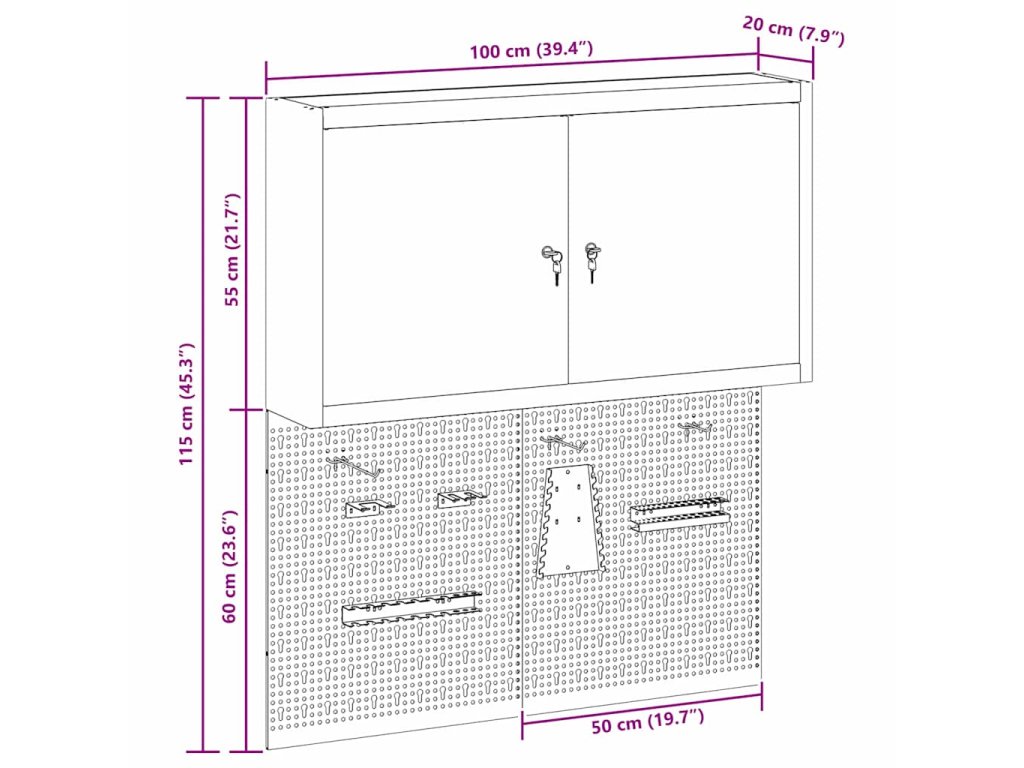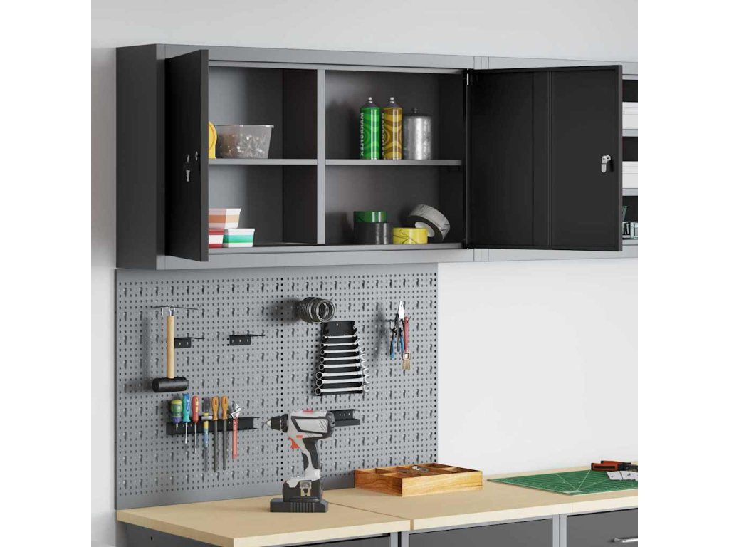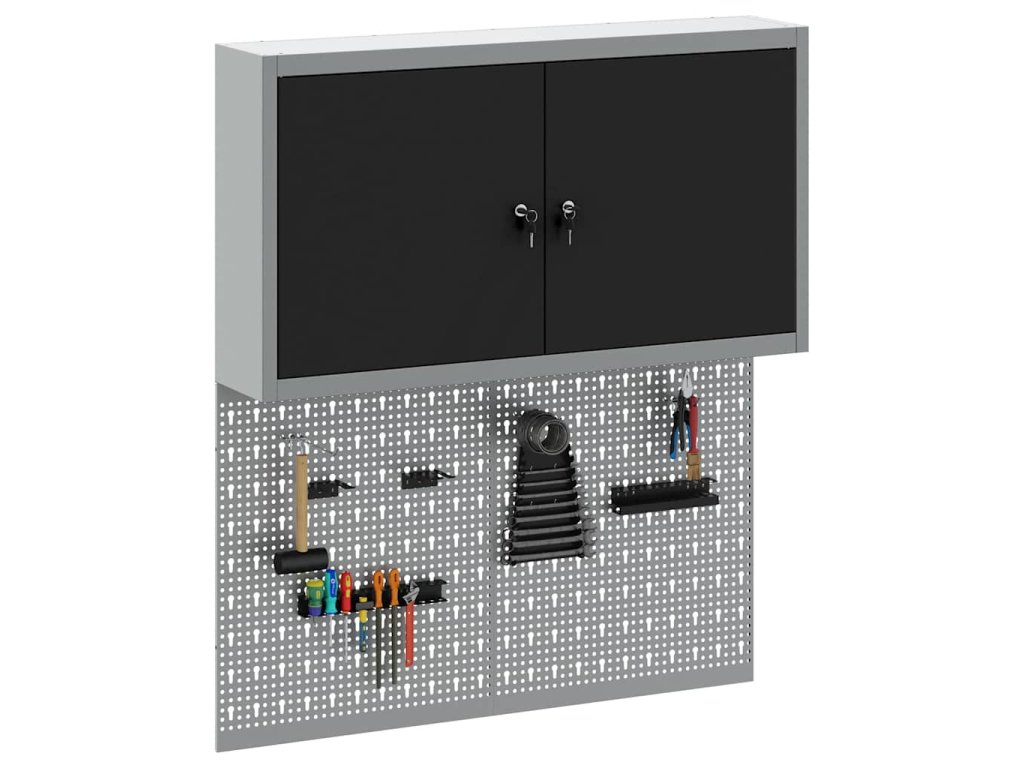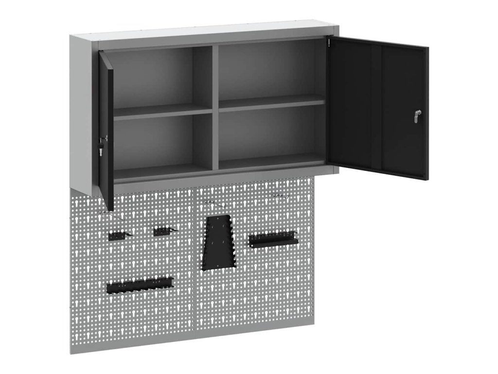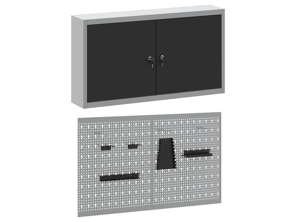 - Komplexní komponenty: Skříňka má kovové police z práškově lakované oceli, které snesou hodně hmotnosti a časté používání. Kovové závěsné desky umožňují snadné přizpůsobení organizace nářadí podle různých typů a velikostí nářadí.