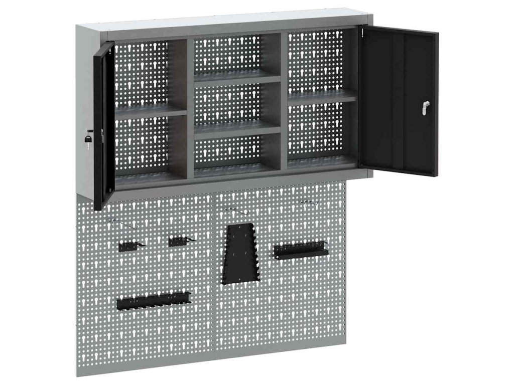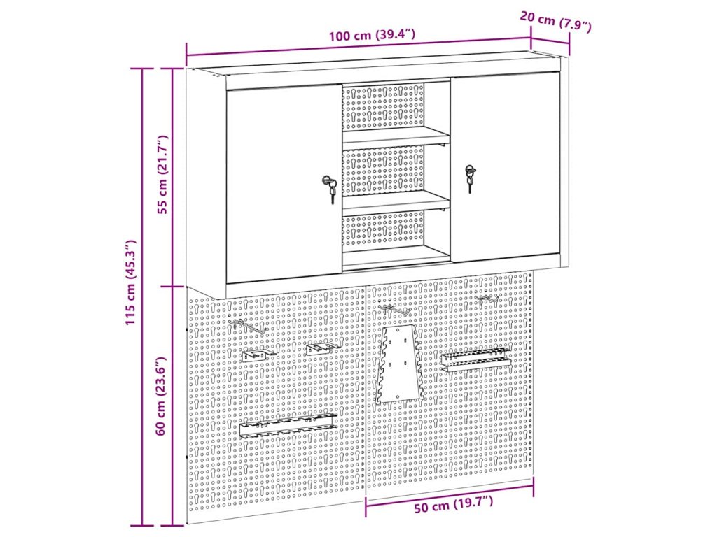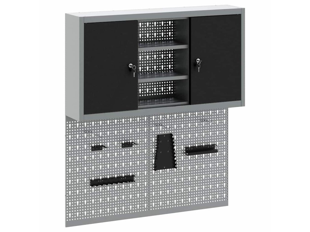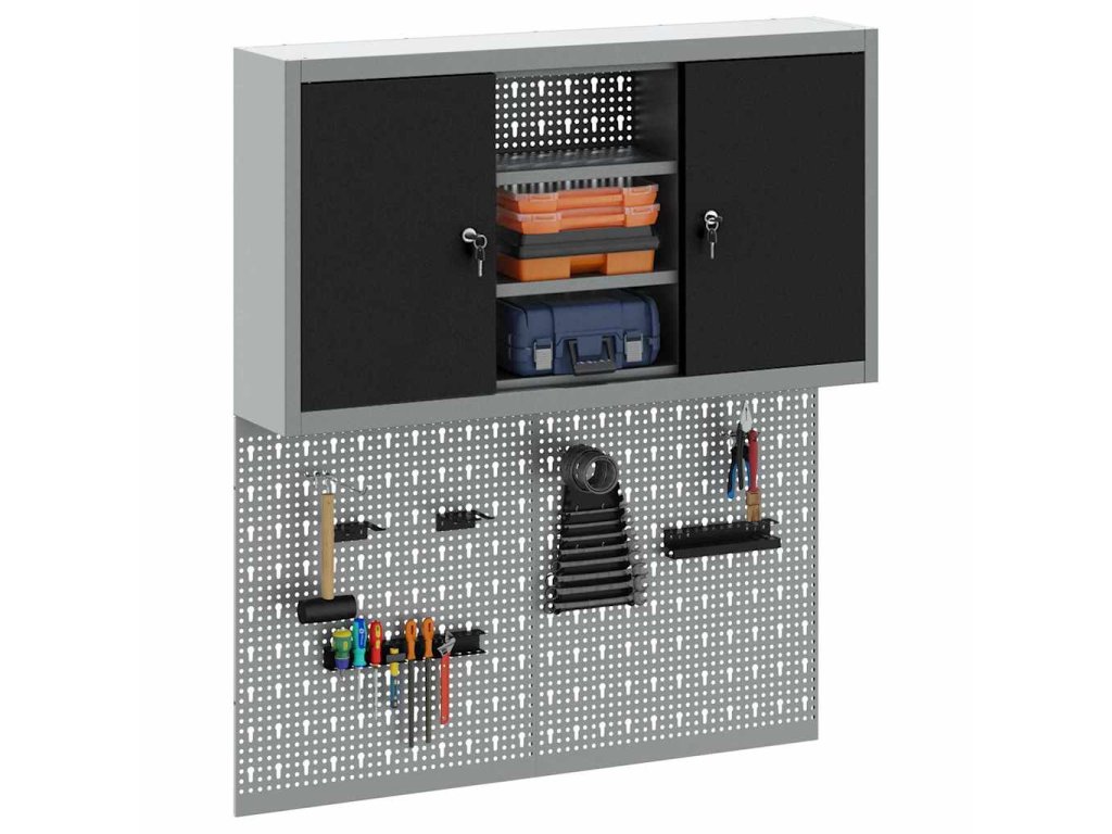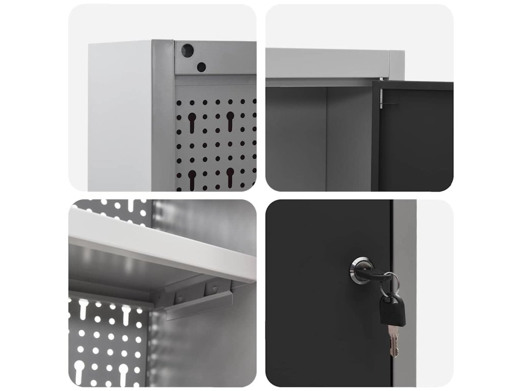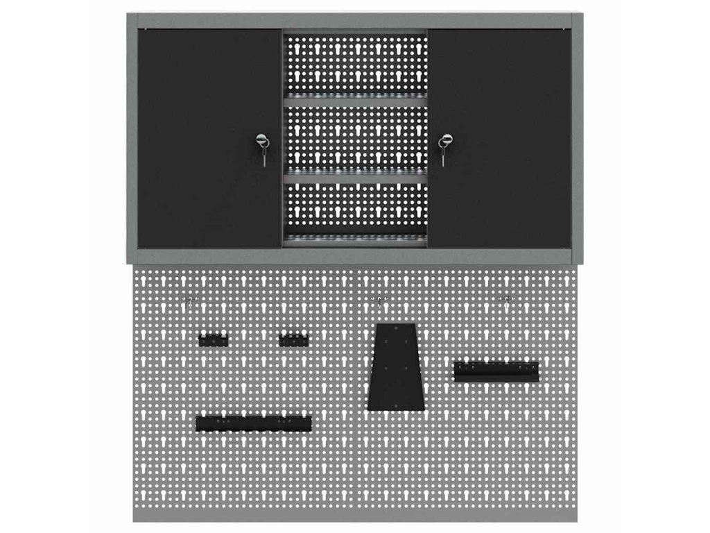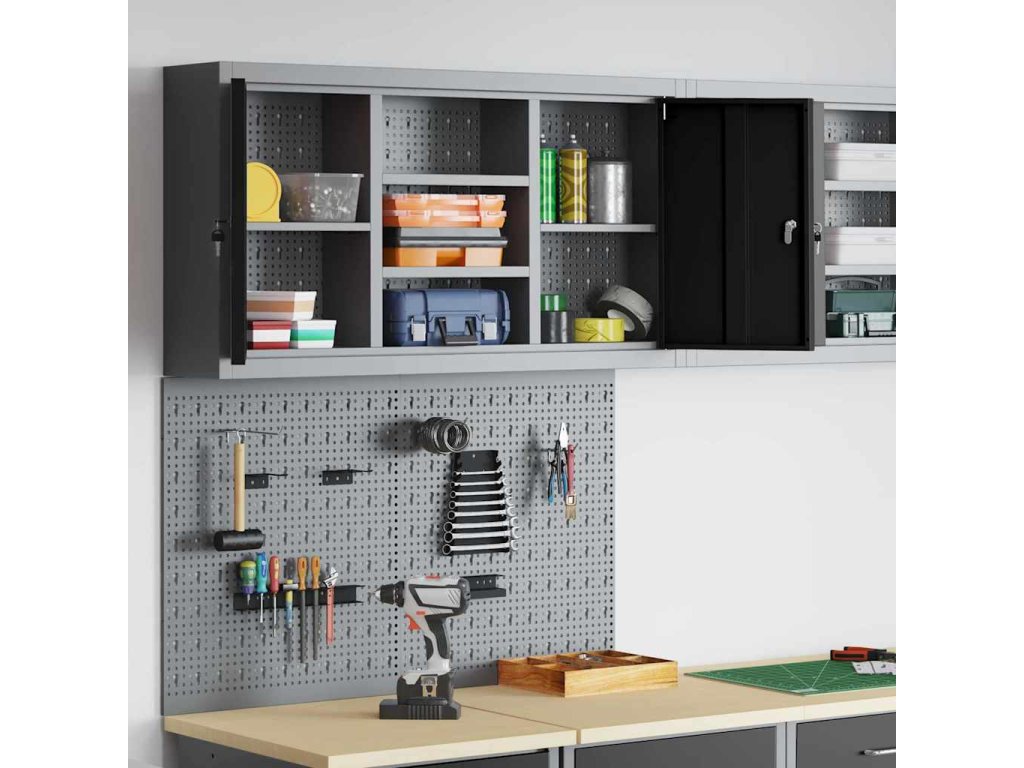 - Komplexní komponenty: Skříňka má kovové police z práškově lakované oceli, které snesou hodně hmotnosti a časté používání. Kovové závěsné desky umožňují snadné přizpůsobení organizace nářadí podle různých typů a velikostí nářadí.