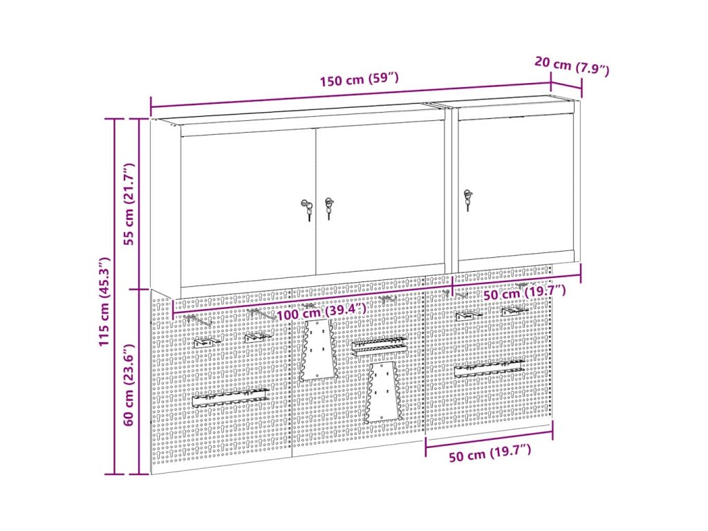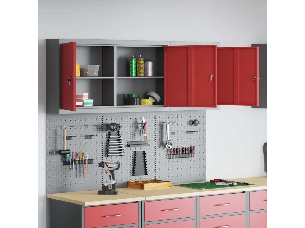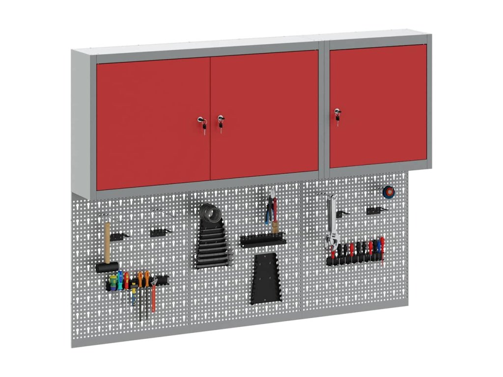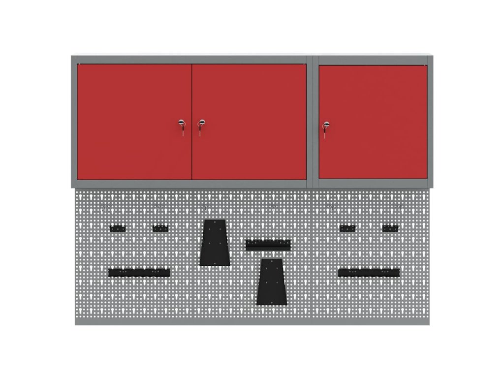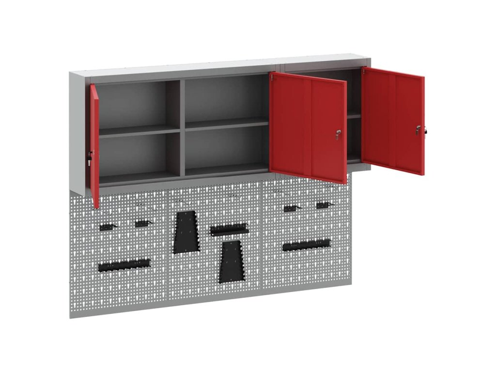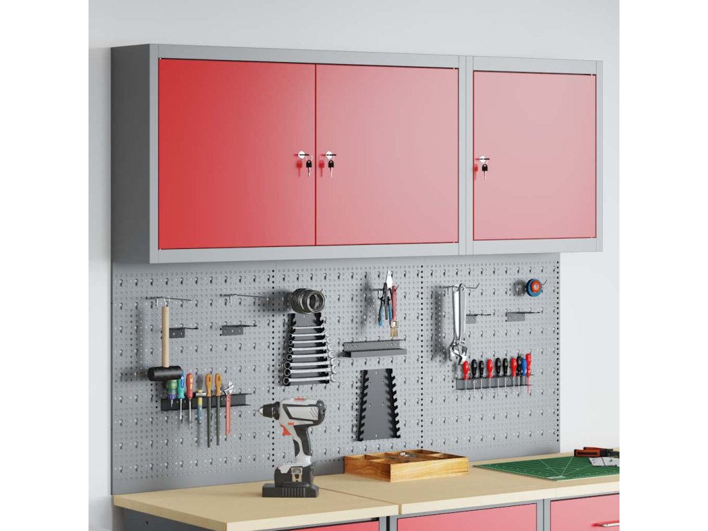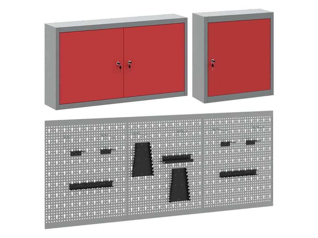 - Komplexní komponenty: Skříňka má kovové police z práškově lakované oceli, které snesou hodně hmotnosti a časté používání. Kovové závěsné desky umožňují snadné přizpůsobení organizace nářadí podle různých typů a velikostí nářadí.