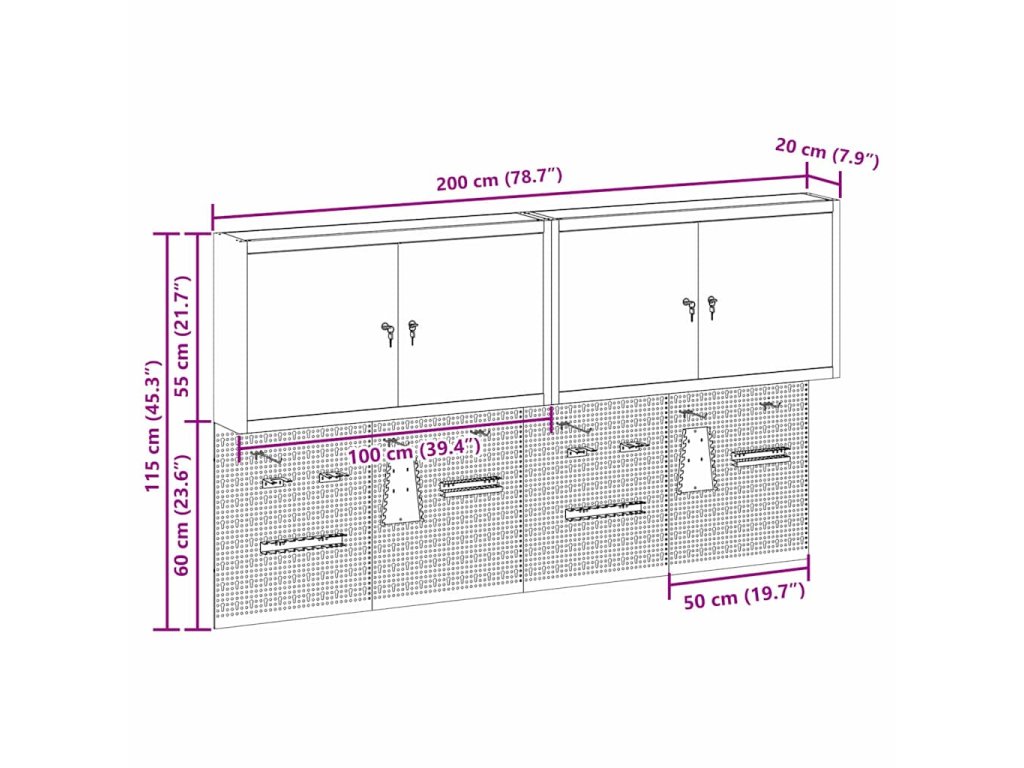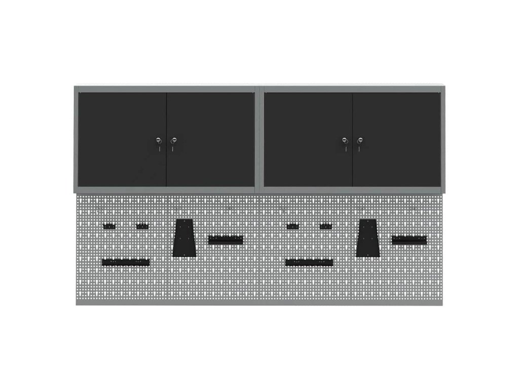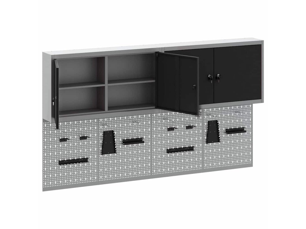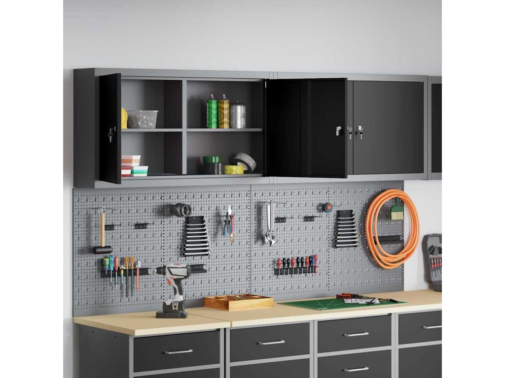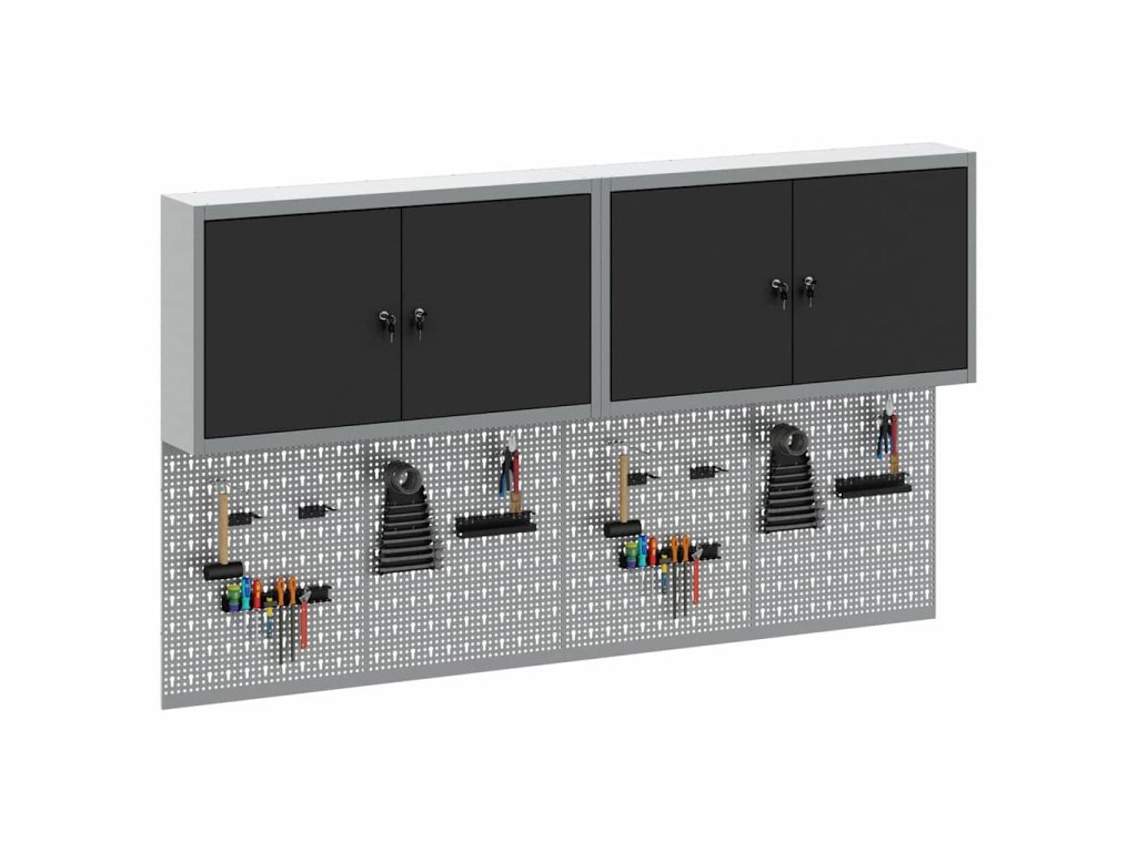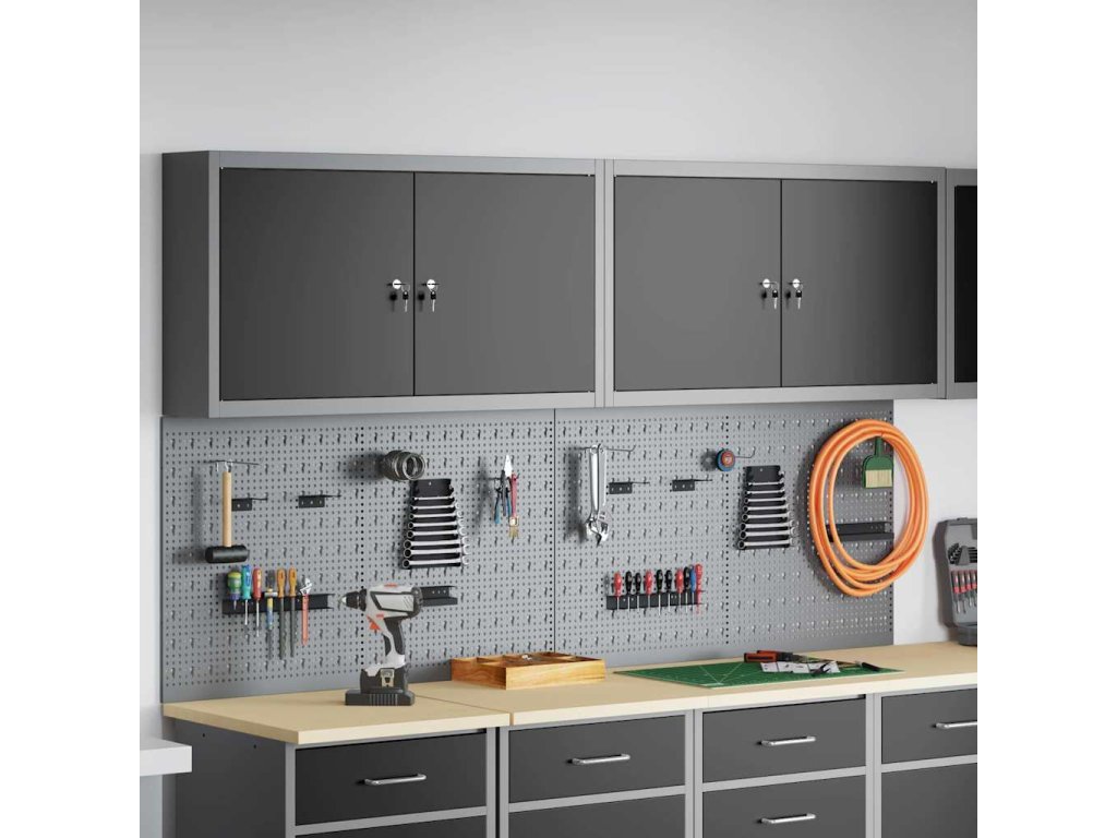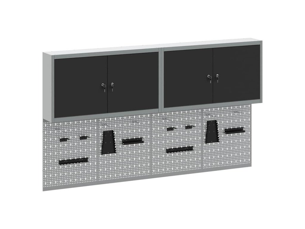 - Komplexní komponenty: Skříňka má kovové police z práškově lakované oceli, které snesou hodně hmotnosti a časté používání. Kovové závěsné desky umožňují snadné přizpůsobení organizace nářadí podle různých typů a velikostí nářadí.