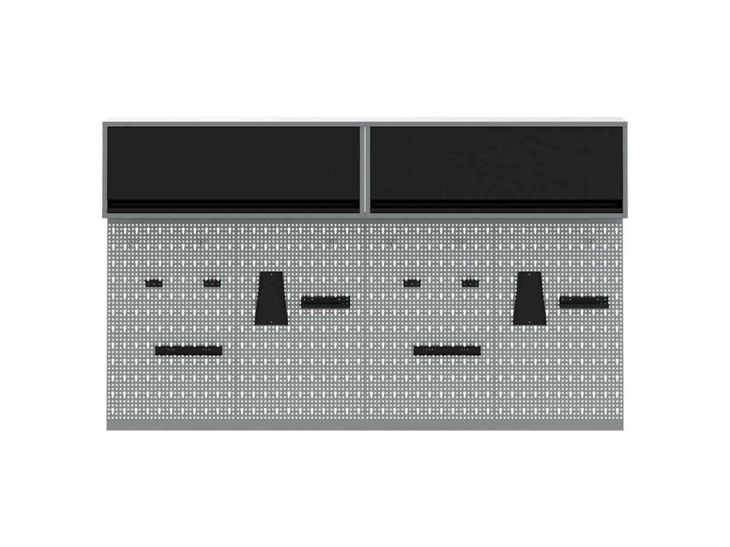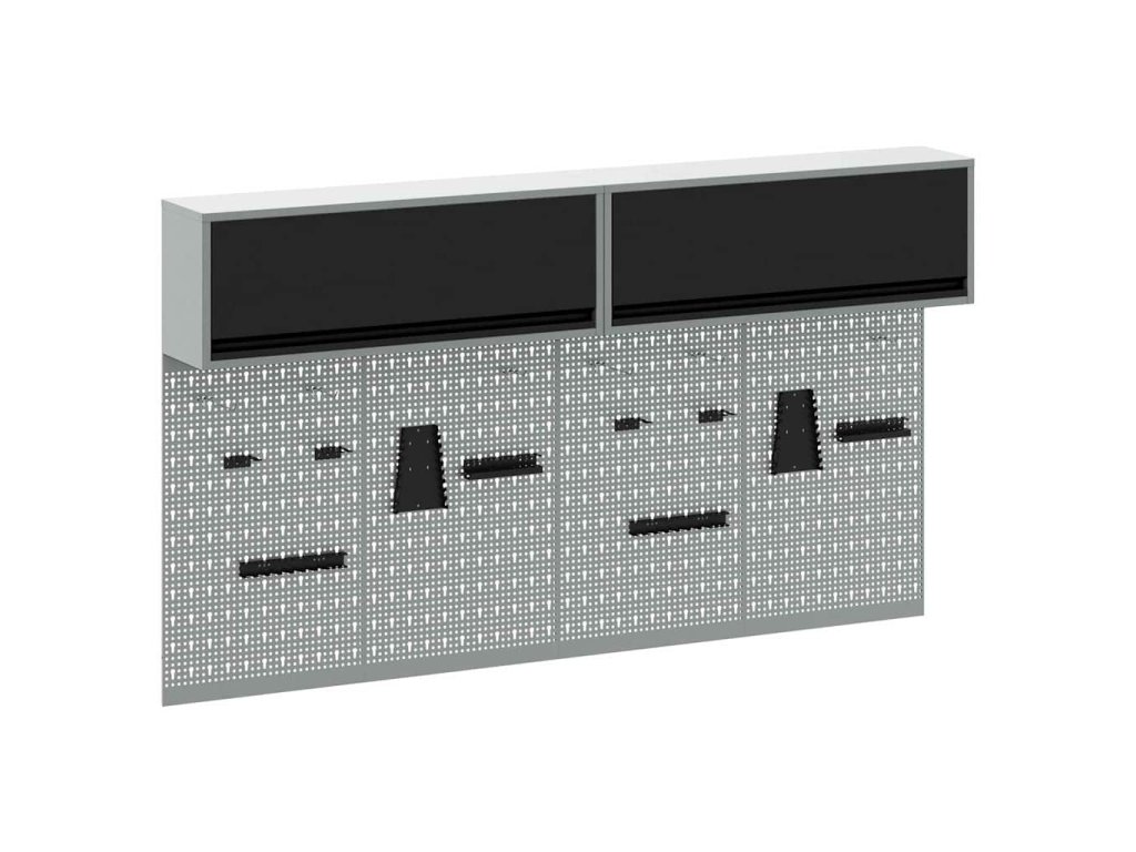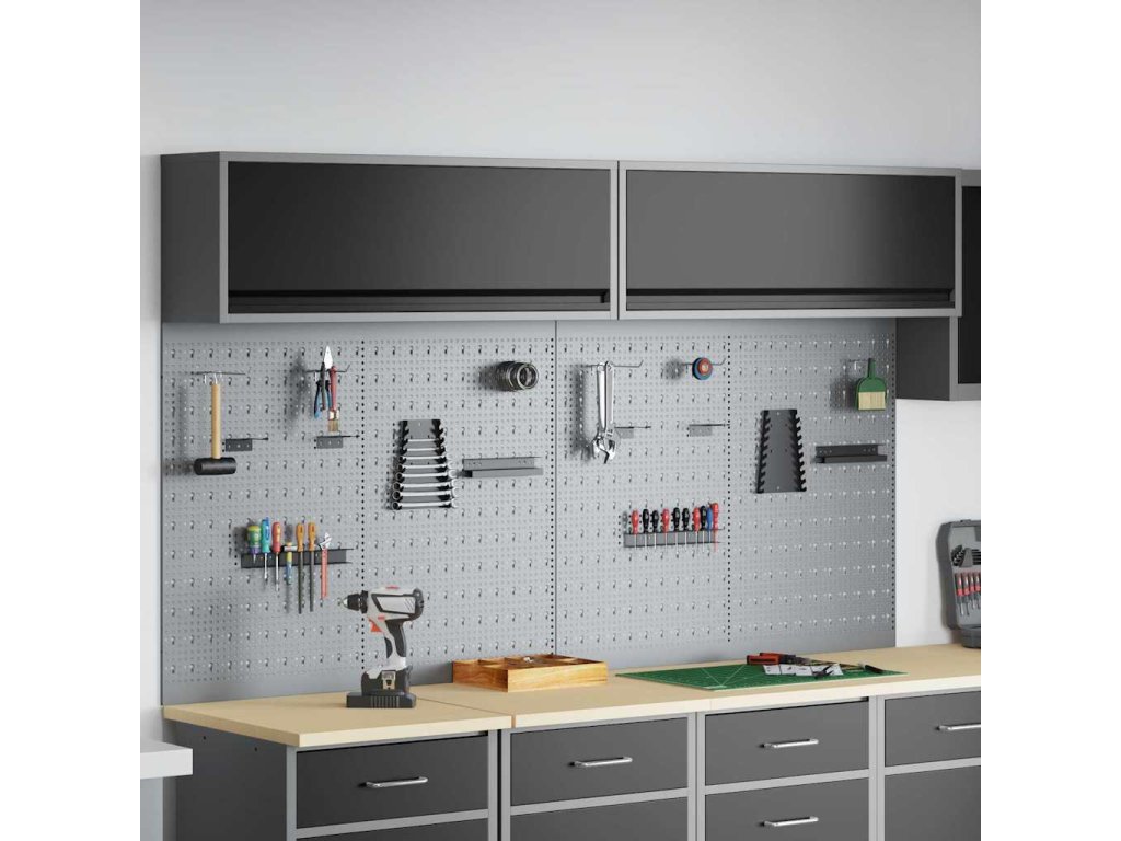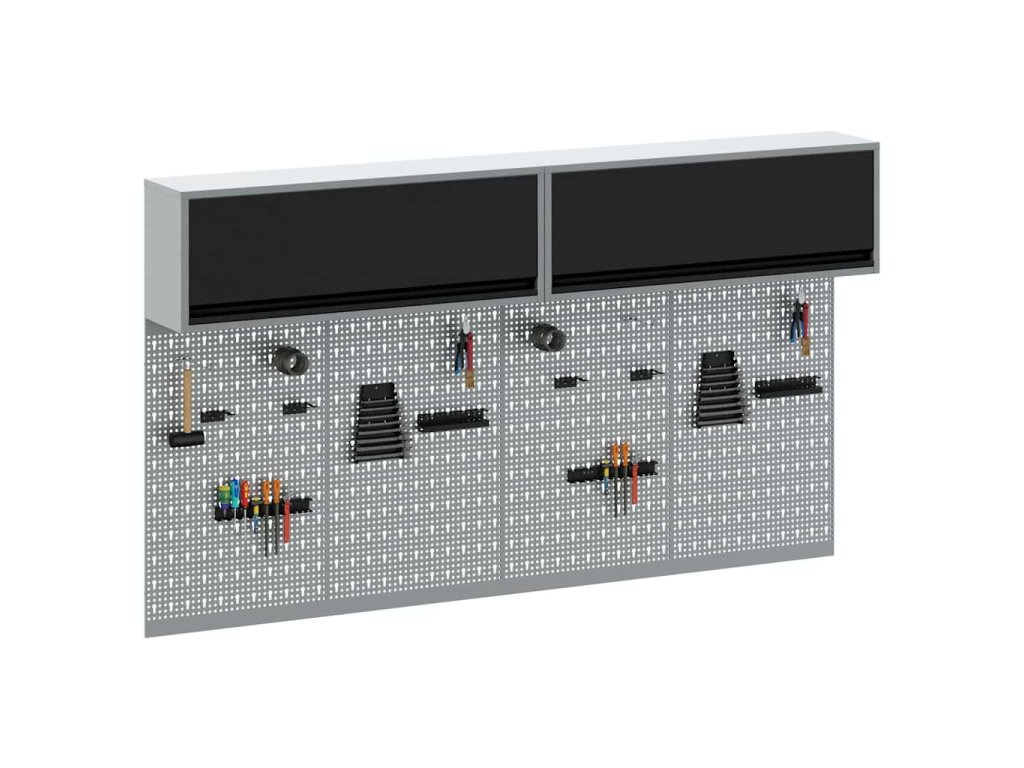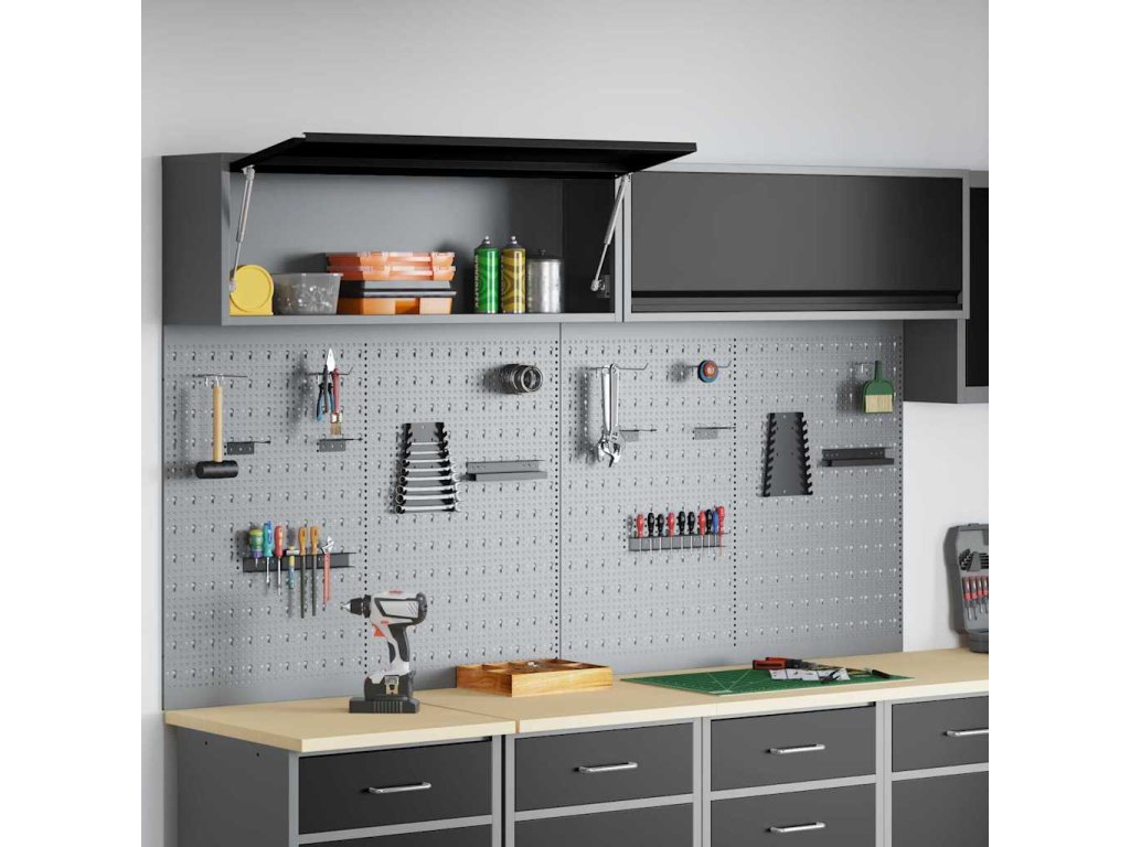 - Komplexní komponenty: Skříňka má kovové police z práškově lakované oceli, které snesou hodně hmotnosti a časté používání. Kovové závěsné desky umožňují snadné přizpůsobení organizace nářadí podle různých typů a velikostí nářadí.