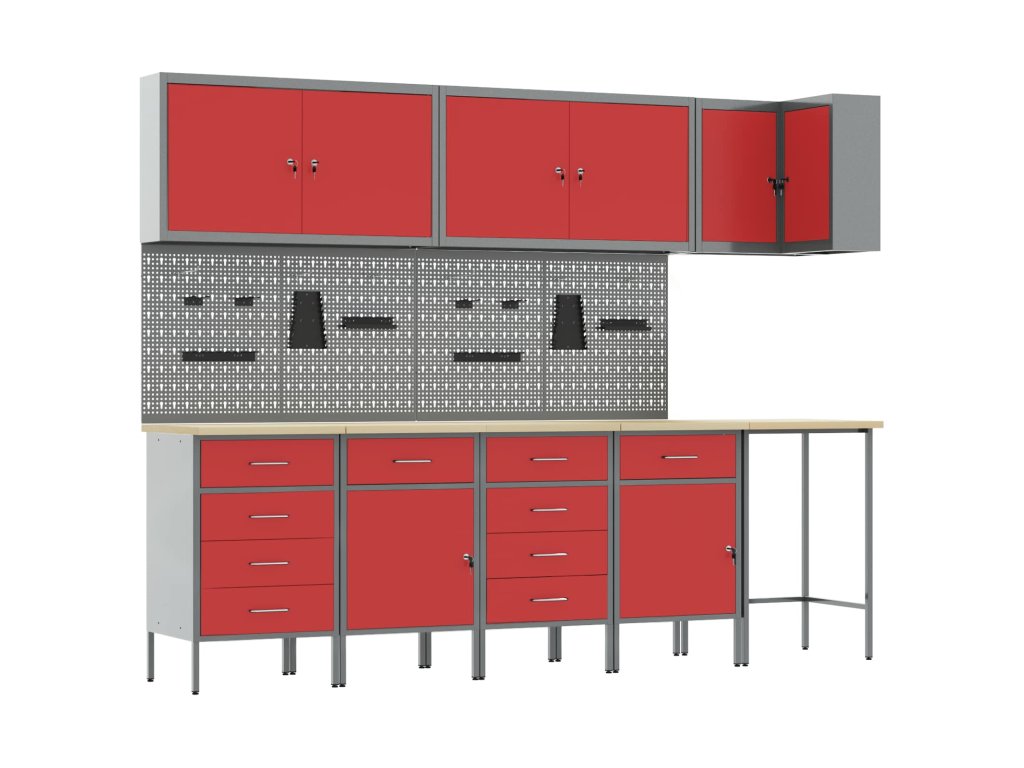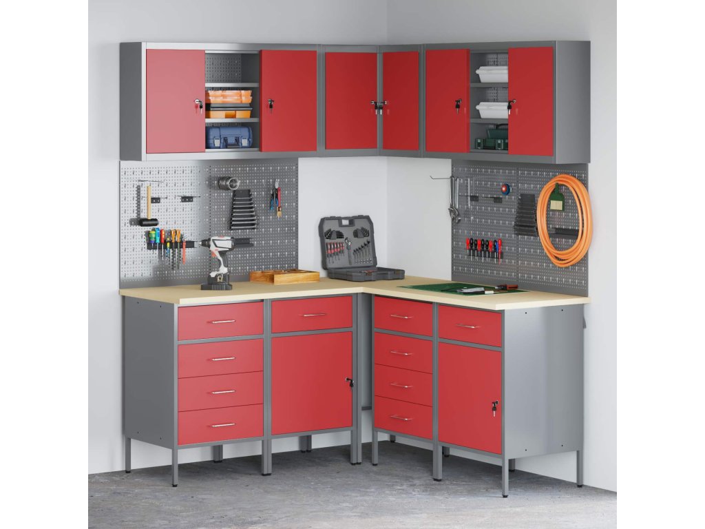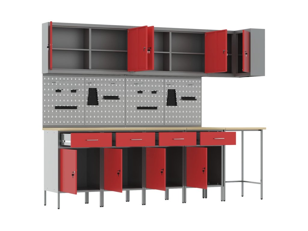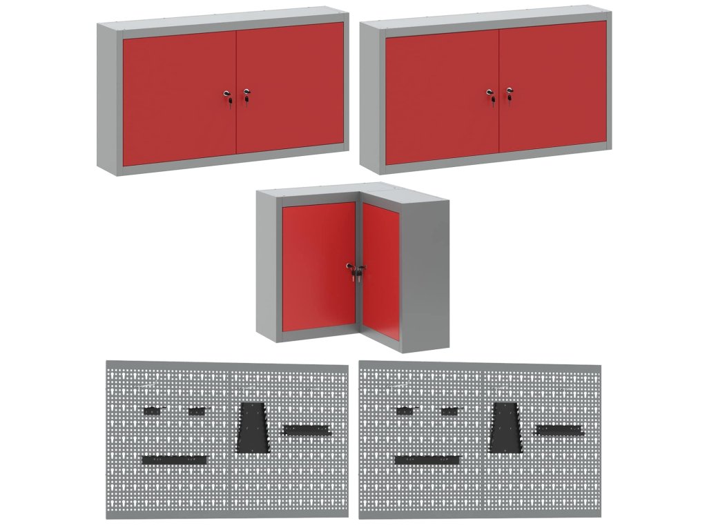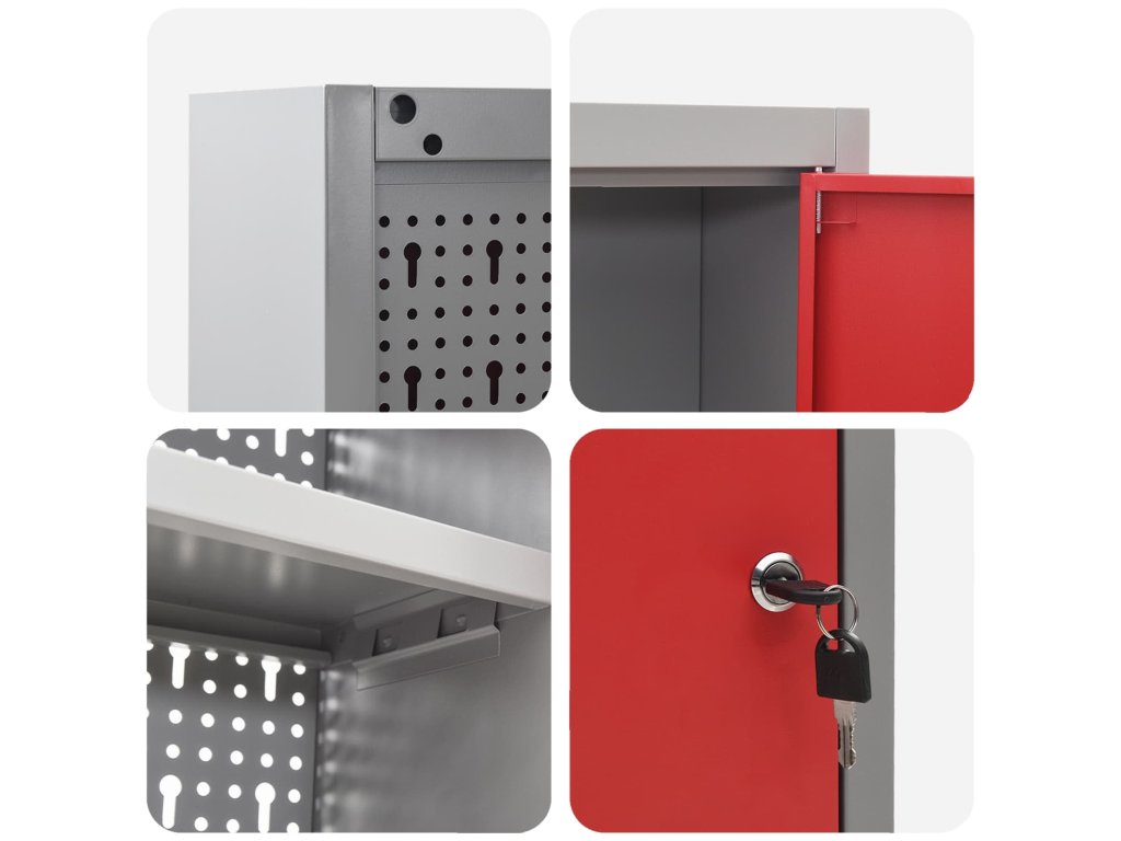 - Komplexní komponenty: Skříňka má kovové police z práškově lakované oceli, které snesou hodně hmotnosti a časté používání. Kovové závěsné desky umožňují snadné přizpůsobení organizace nářadí podle různých typů a velikostí nářadí.