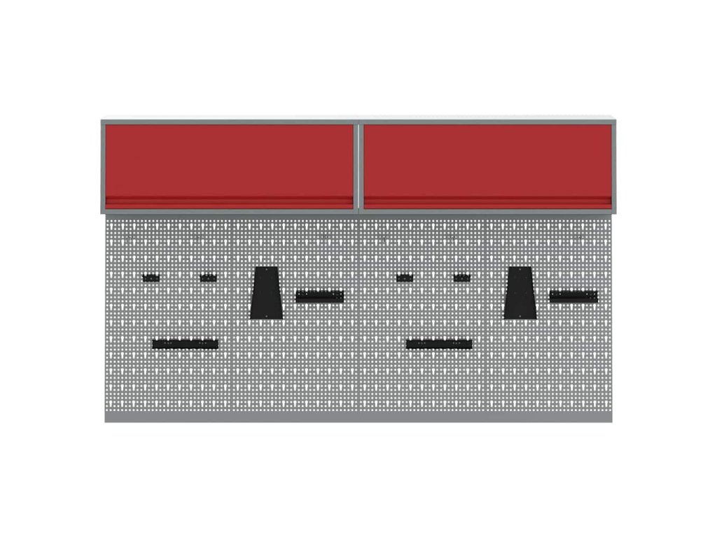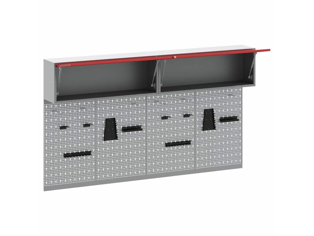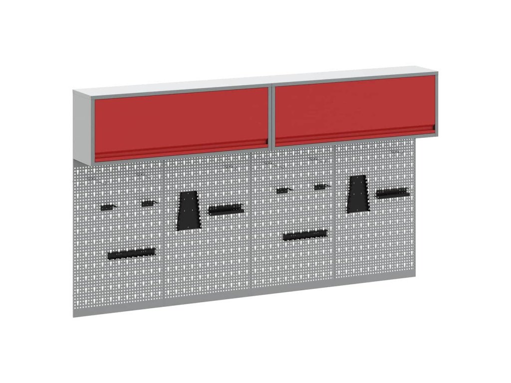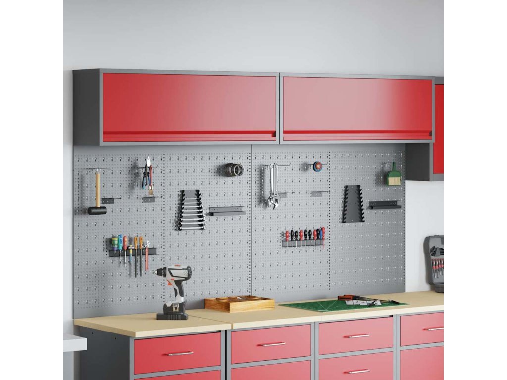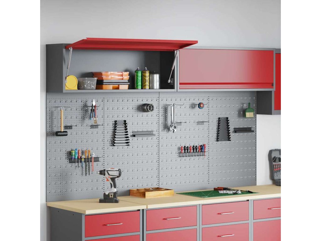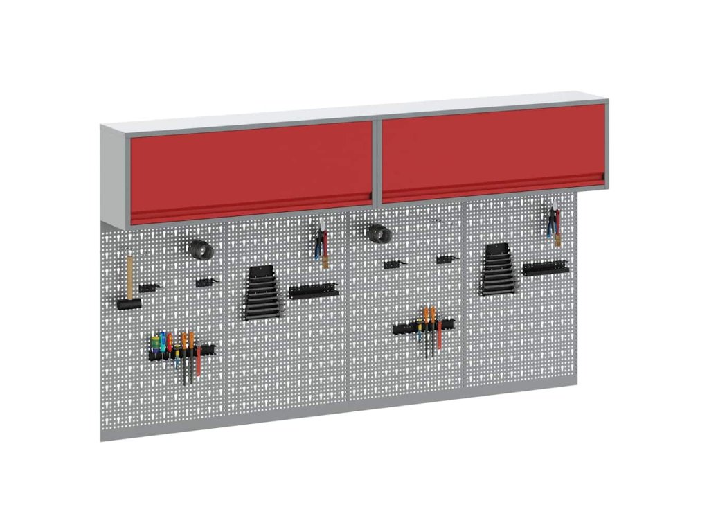 - Komplexní komponenty: Skříňka má kovové police z práškově lakované oceli, které snesou hodně hmotnosti a časté používání. Kovové závěsné desky umožňují snadné přizpůsobení organizace nářadí podle různých typů a velikostí nářadí.