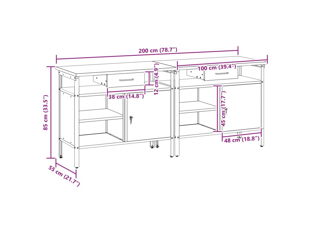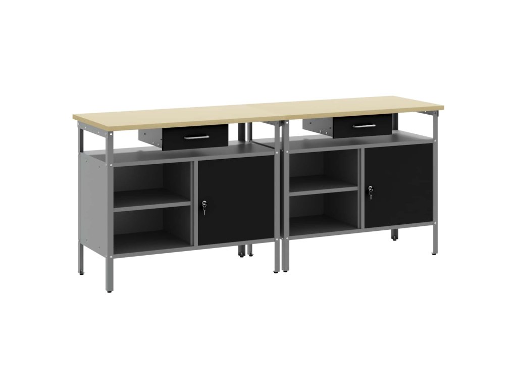Tato sada pracovních stolů z oceli je ideální kombinací funkčnosti a průmyslového stylu pro profesionální dílny i domácí garáže. Obdélníkový stůl zvládne i těžší úkoly a má moderní design. Díky hladkému povrchu se bezproblémově hodí do jakéhokoliv prostoru. Kovové police poskytují dost úložného místa, takže máte nářadí a potřeby pěkně srovnané a přehledné. Představte si tento stůl jako středobod vašeho pracovního místa, který dodává atmosféru profesionality, pořádku a stylu.