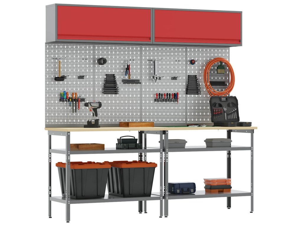 - Kovové police: Tyto police nabízejí dost místa na nářadí. Jsou navržené pro časté používání a unese hodně hmotnosti, což usnadňuje organizaci.