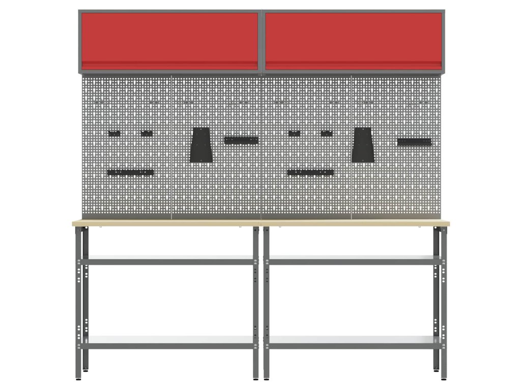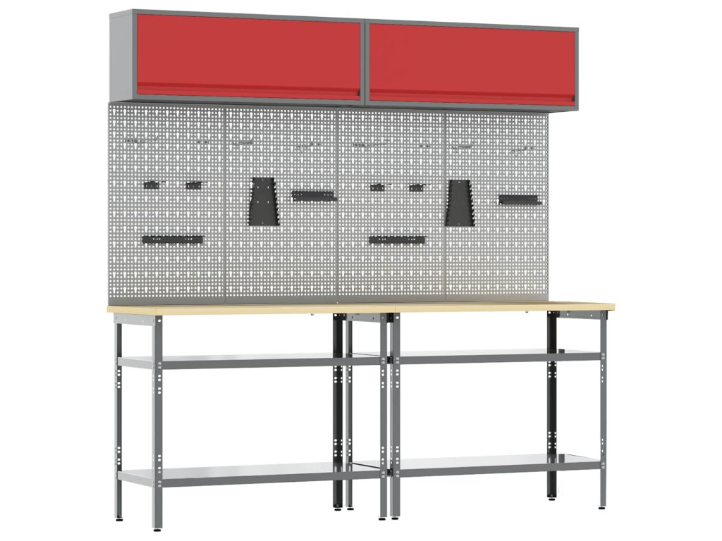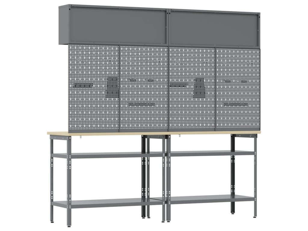 Tato sada pracovních stolů z oceli je ideální kombinací funkčnosti a průmyslového stylu pro profesionální dílny i domácí garáže. Obdélníkový stůl zvládne i těžší úkoly a má moderní design. Díky hladkému povrchu se bezproblémově hodí do jakéhokoliv prostoru. Kovové police poskytují dost úložného místa, takže máte nářadí a potřeby pěkně srovnané a přehledné. Představte si tento stůl jako středobod vašeho pracovního místa, který dodává atmosféru profesionality, pořádku a stylu.