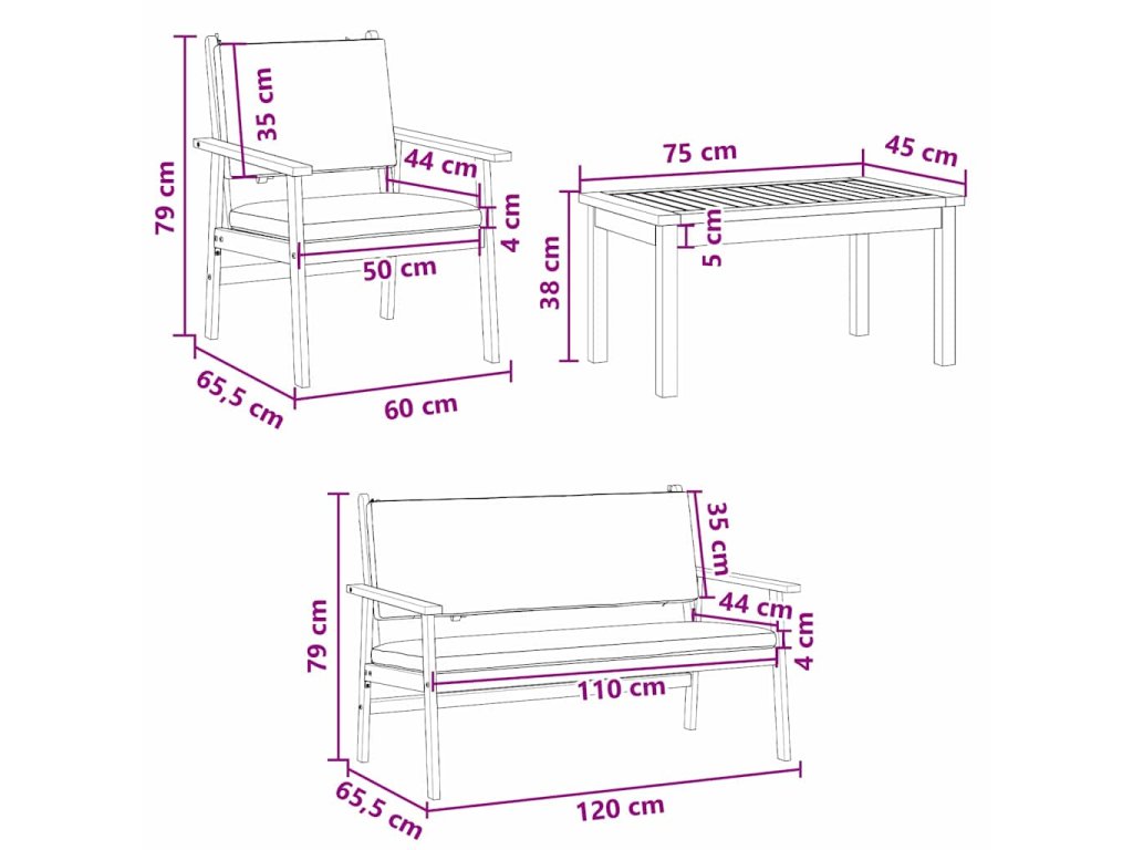 - 1 x lavice: 120 x 65,5 x 79 cm (D x Š x V)