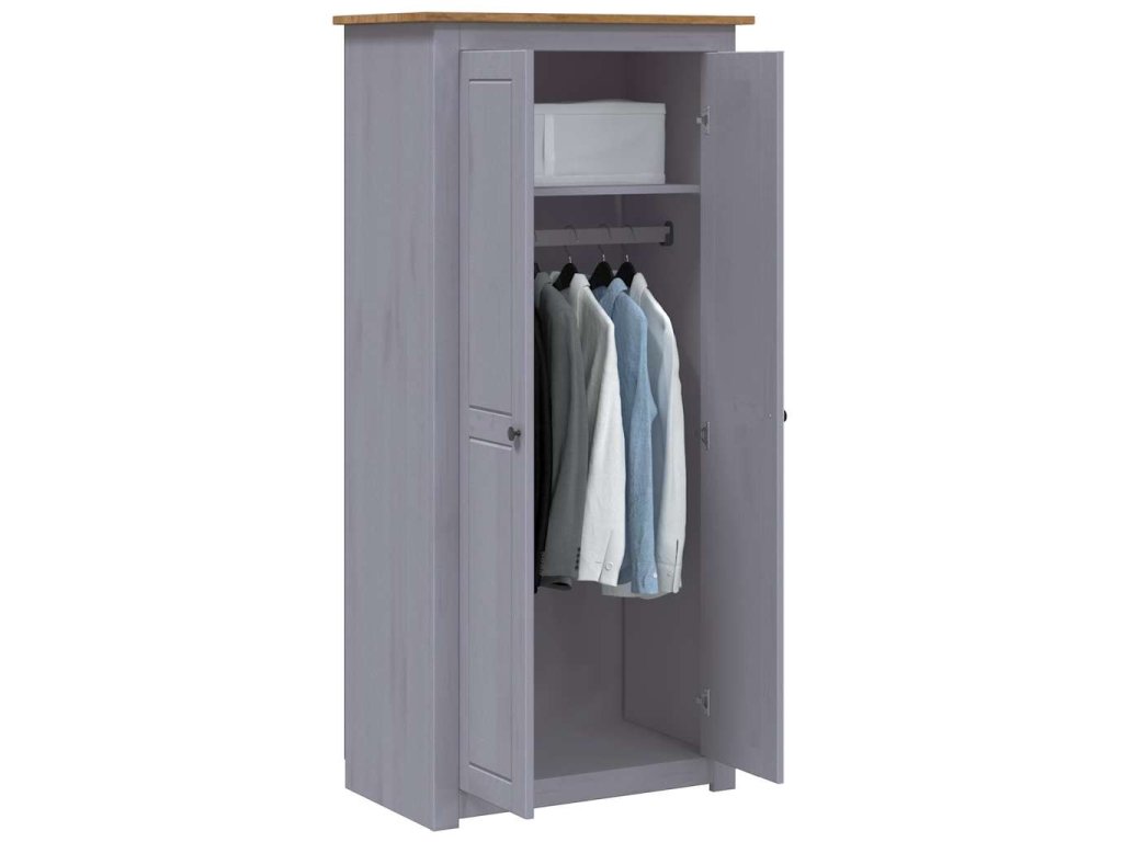 Textilní skříň má pevnou polici pro uložení a uspořádání bot, svetrů, džínů, klobouků, kabelek atd. Velká přihrádka je vybavená tyčí na ramínka, takže ji můžete použít k zavěšení kabátů, šatů apod. Šatní skříň je vyrobená z masivního borového dřeva, je tedy robustní a zaručuje dlouhodobé používání.