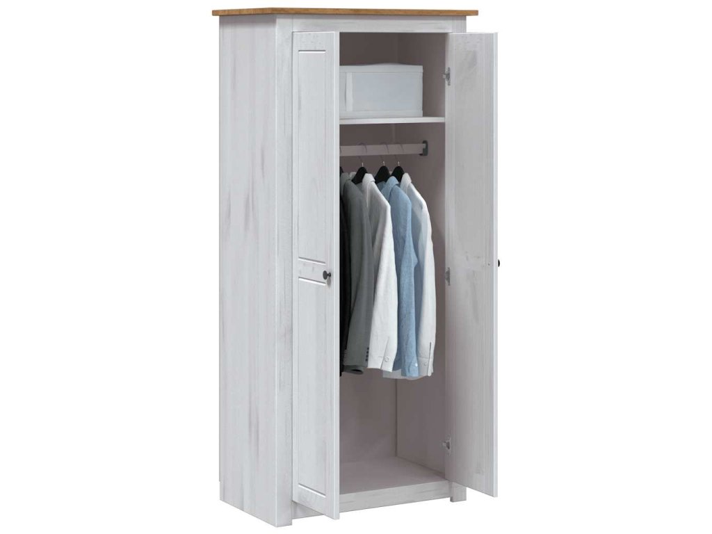 Textilní skříň má pevnou polici pro uložení a uspořádání bot, svetrů, džínů, klobouků, kabelek atd. Velká přihrádka je vybavená tyčí na ramínka, takže ji můžete použít k zavěšení kabátů, šatů apod. Šatní skříň je vyrobená z masivního borového dřeva, je tedy robustní a zaručuje dlouhodobé používání.