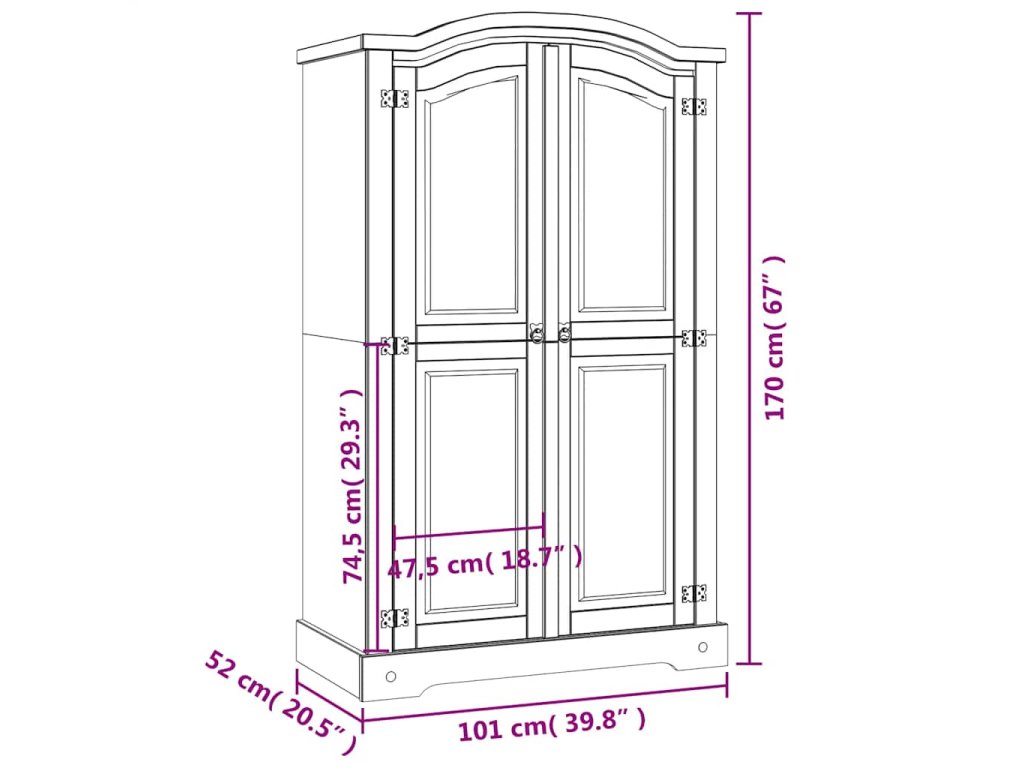 Tato vysoce kvalitní dřevěná šatní skříň je vyrobená v mexickém stylu Corona. Voskované borové dřevo a prvky z černého kovu propůjčují šatní skříni mexický šarm, který dokonale zkompletuje zařízení vaší ložnice, obývacího pokoje nebo salónku.