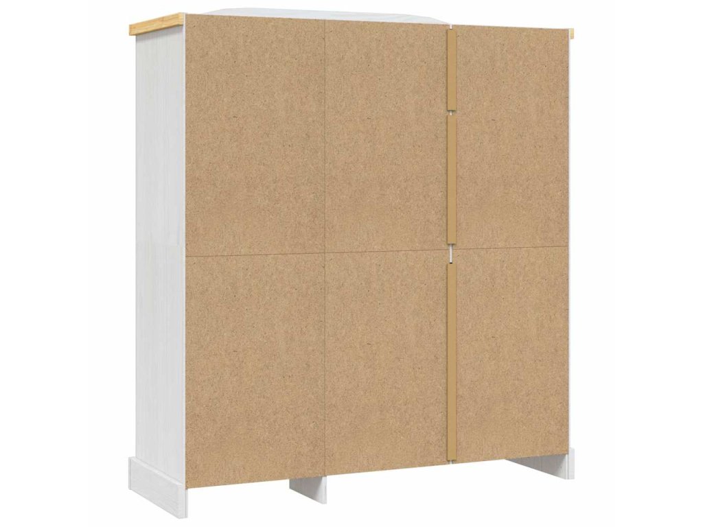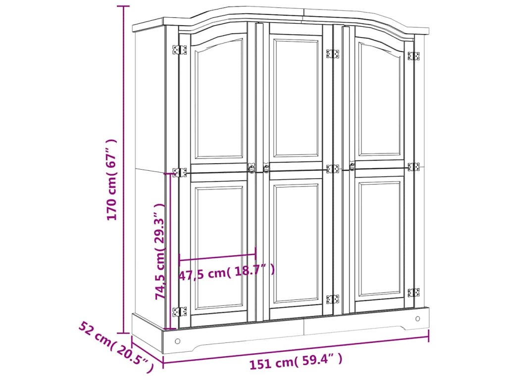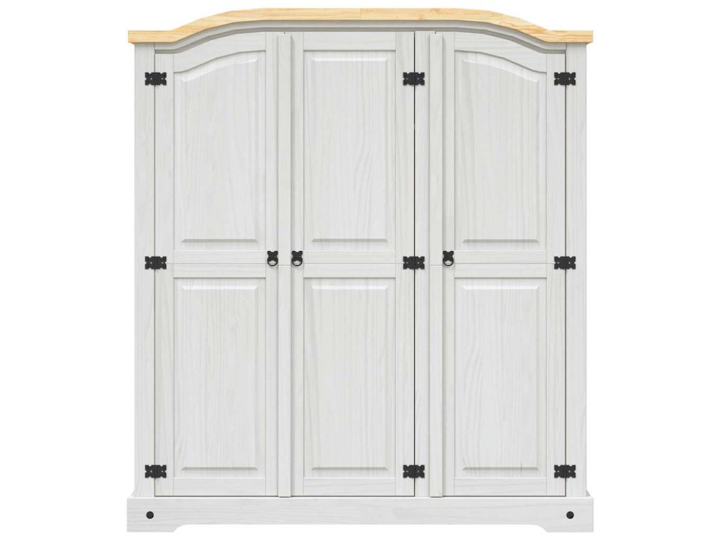 Šatní skříň má krásný klenutý design horní části a 3křídlé dveře. Pevná a bytelná skříň je zhotovená z masivního borového dřeva. V prostorné levé části je horní police a tyč na ramínka pro snadnou organizaci vašeho oblečení. V pravé části skříně jsou čtyři police, které jsou ideální pro vaše spodní prádlo, ponožky apod.