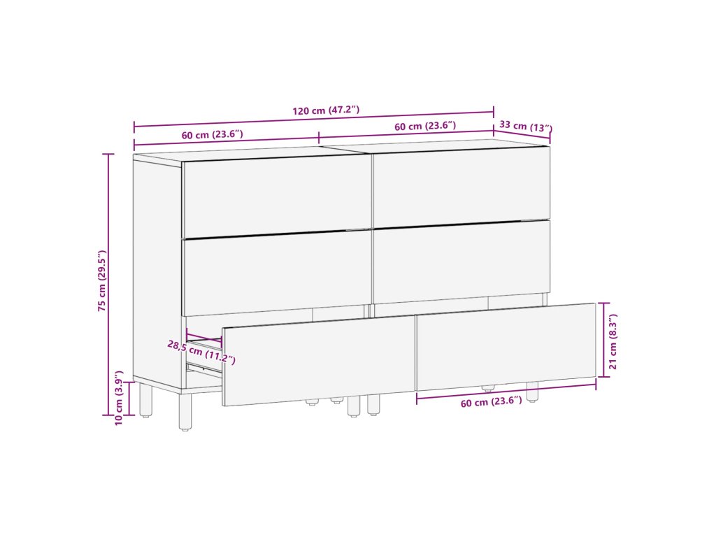 - Materiály: Tato komoda je vyrobena z luxusního mango dřeva, které dodává přirozený vzhled a pevnost. Dřevo je pečlivě vybíráno díky své hezké struktuře a textuře, což přináší nejen skvělý vzhled, ale i dlouhou životnost. Mango dřevo je odolné proti běžnému používání, což znamená, že komoda vám vydrží pěkně dlouho.