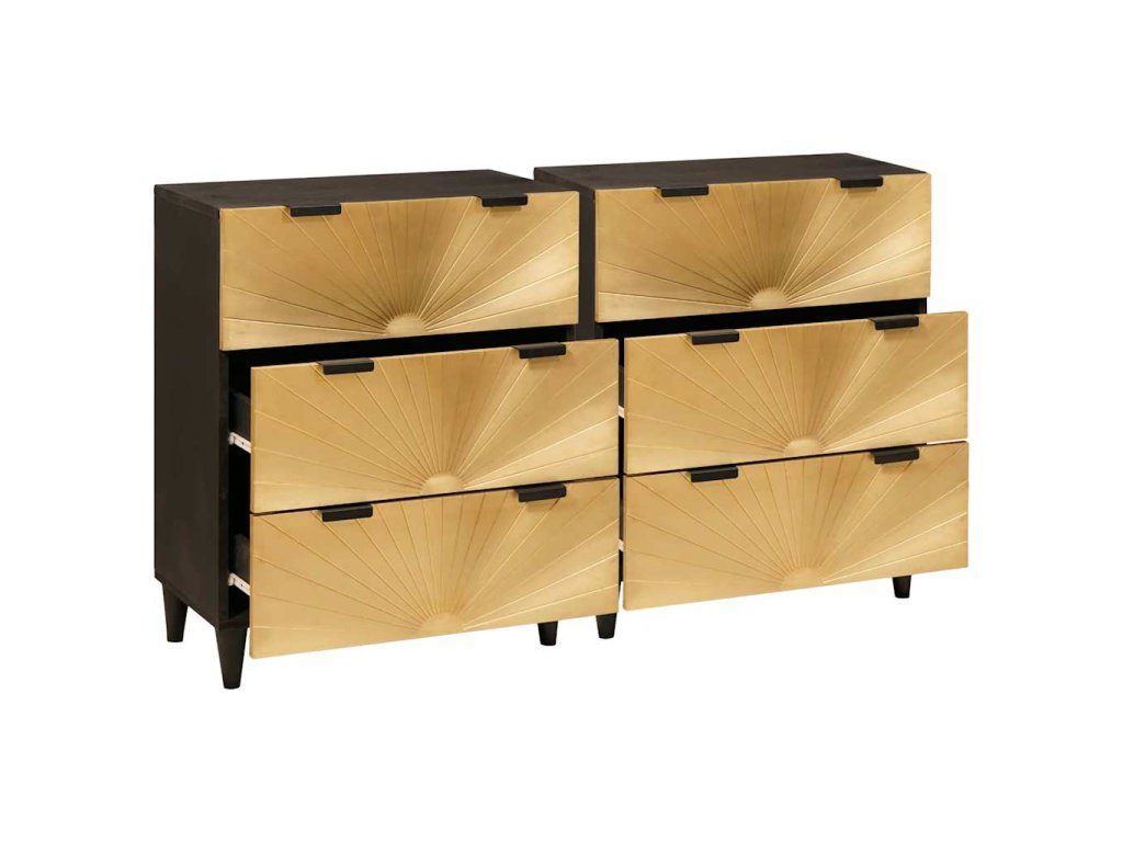 Masivní dřevěná komoda je kousek, který se skvěle hodí do obýváku nebo jídelny a vyniká kombinací funkčnosti a designu. S inspiracemi z Art Deco ukazuje stylové geometrické vzory a luxusní detaily, a její černé a zlaté odstíny dodávají trochu glamouru. Není to jen o vzhledu, ale i o chytrém úložném řešení s dostatkem přihrádek na nádobí nebo věci do obýváku, abys udržel svůj domov uklizený a organizovaný.