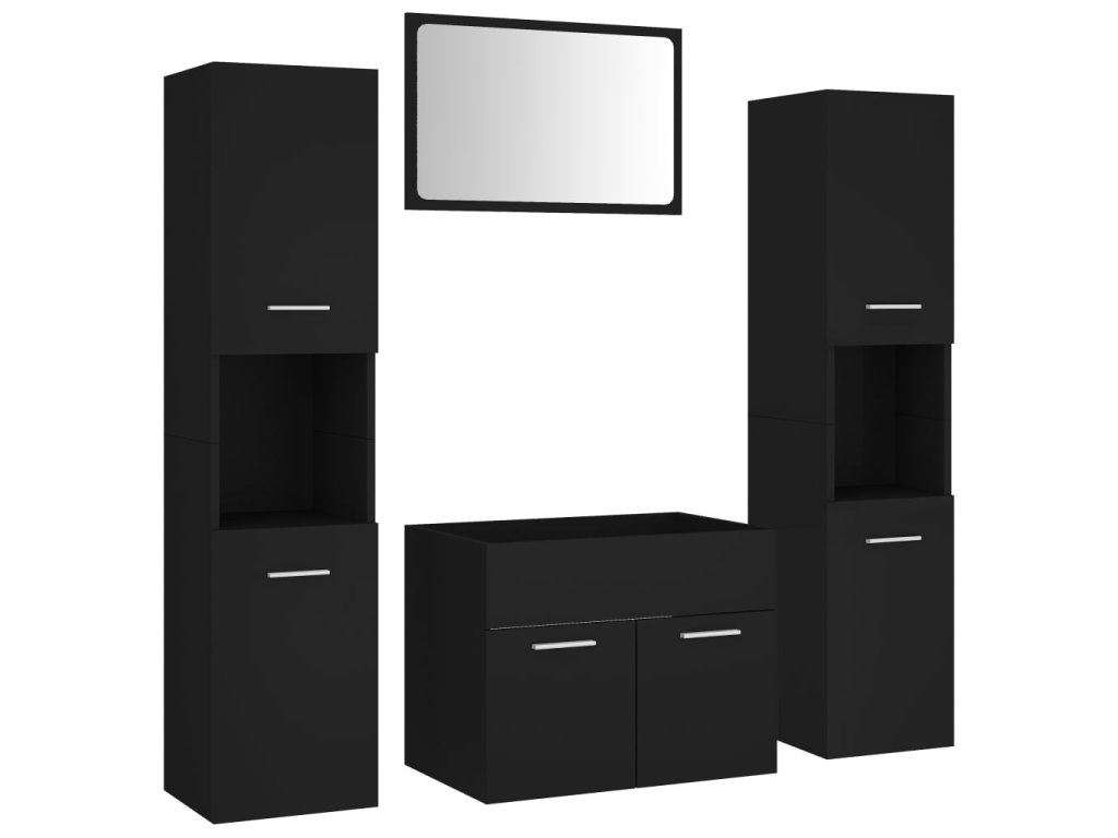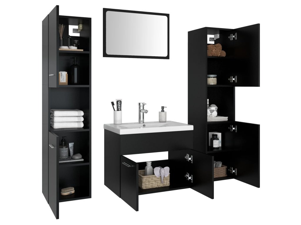Sada nábytku obsahuje skříňku pod umyvadlo, 2 vysoké skříně a zrcadlo. Stylová umyvadlová skříňka má 1 přihrádku a nahoře je ideálně uzpůsobená k umístění umyvadla. V každé z vysokých skříní najdete za dvěma dvířky celkem 5 přihrádek, které vám poskytnou spoustu místa k uložení vašich věcí. Zrcadlo zase dodá vaší domácnosti nový půvab. Celý set koupelnového nábytku snadno očistíte navlhčeným hadříkem.
