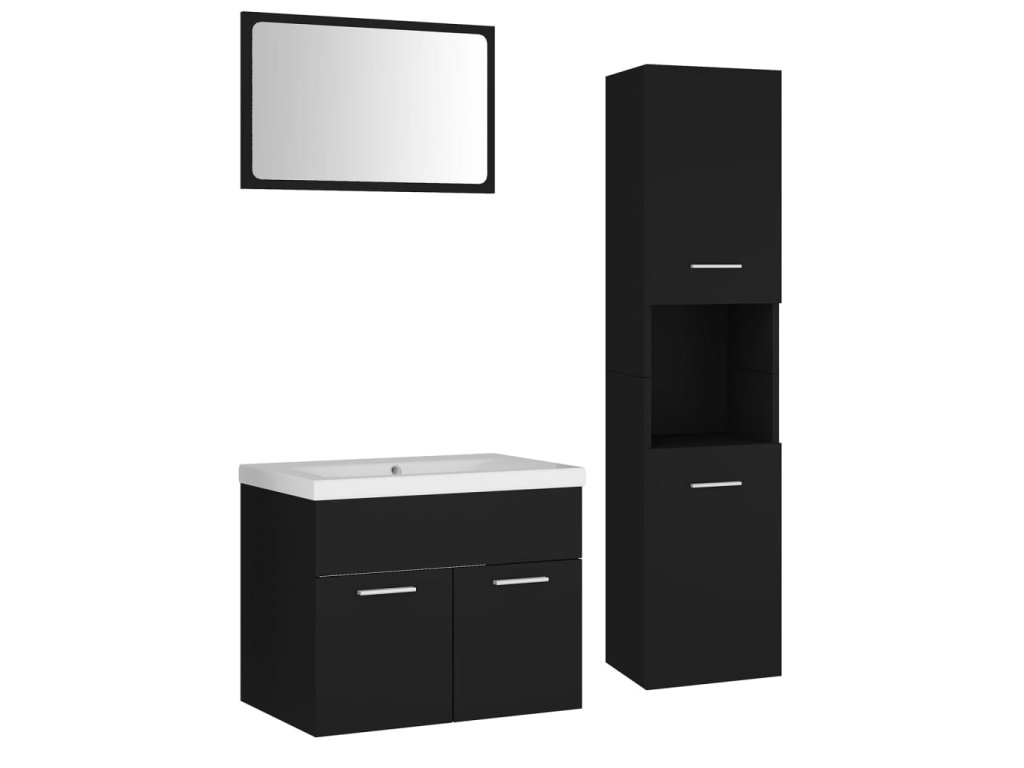 Sada nábytku obsahuje umyvadlovou skříňku s umyvadlem, vysokou skříň a zrcadlo. Stylová skříňka pod umyvadlo má 1 přihrádku, dokonale se hodí pod vaše umyvadlo a nabídne vám šikovné úložné řešení do koupelny. Keramické umyvadlo neslouží pouze jako hygienická nádoba pro každodenní použití – hraje také významnou dekorativní roli. Svým trendovým a moderním designem navíc krásně doplní každý styl zařízení. Je vybavené také přepadem, který umožňuje odtékání vody v případě, že se umyvadlo příliš přeplní. Ve vysoké skříni s dvěma dvířky se nachází celkem 5 přihrádek, jež vám poskytnu spoustu místa k uložení vašich věcí. Zrcadlo zase přidá vaší domácnosti na půvabu. Celý set koupelnového nábytku lze snadno očistit navlhčeným hadříkem.