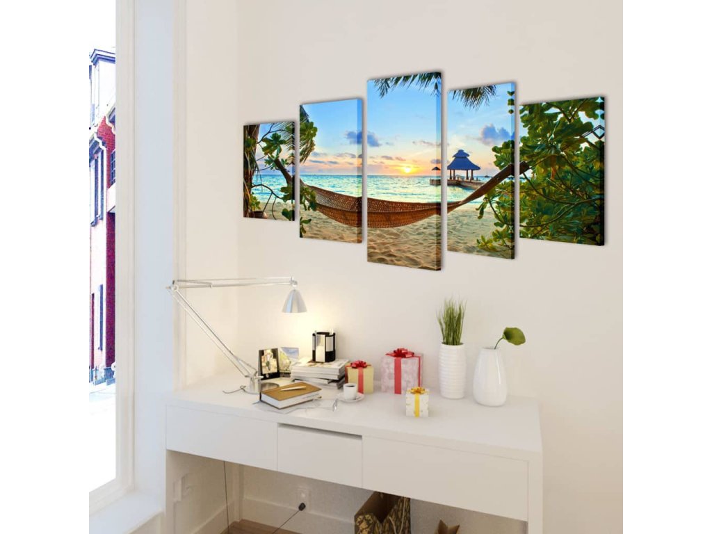 Tato sada nástěnných potištěných pláten je vyrobená z vysoce kvalitního plátna a je voděodolná, takže se snadno čistí. Potisk s motivem pláže s houpací sítí s sebou přináší tropickou atmosféru.