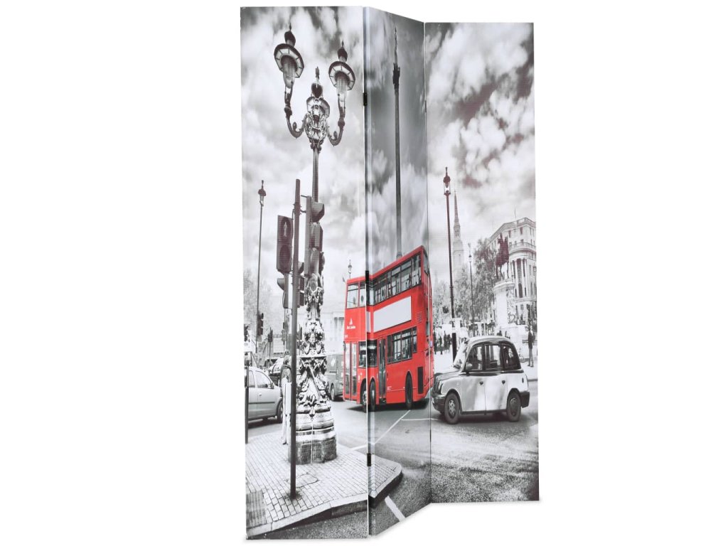 Tato dělící stěna má masivní dřevěný rám a je potažena odolným plátnem, na kterém je krásná monochromatická fotografie vyobrazující ulici v Londýně s ikonickým dvoupatrovým autobusem v kontrastní červené barvě a vašemu interiéru dodá nádech moderního stylu. Tato dělící stěna může být pro úsporu místa také jednoduše složena, když ji právě nepoužíváte.