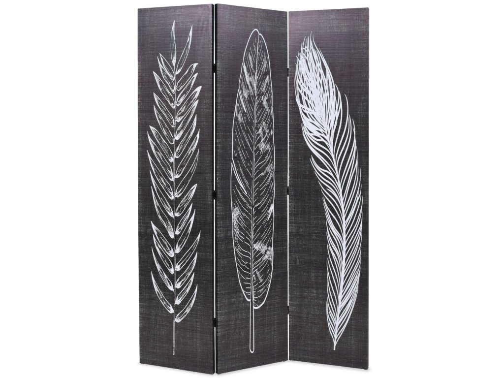 Paraván má masivní dřevěný rám a je pokryt odolným plátnem, který má na obou stranách sofistikovaný potisk na motiv pírek. Do vašeho pokoje vnese zajímavý styl a dekor. Paraván lze také snadno složit pro úsporné skladování, když ho právě nepoužíváte.