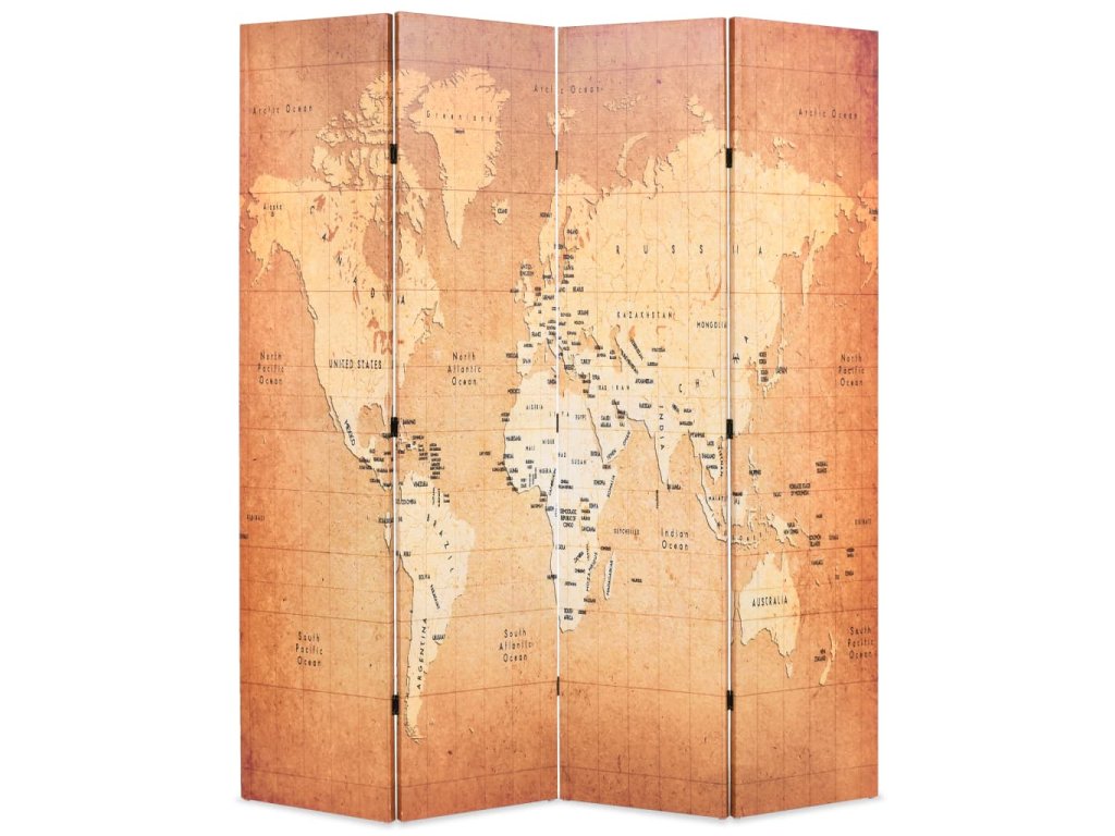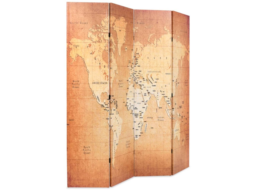 Paraván má masivní dřevěný rám a je pokrytý odolným plátnem, na kterém je natištěna mapa světa v zemitých tónech. Vašemu interiéru dodá dotek moderního šarmu. Paraván lze také snadno sklopit pro úsporné skladování, když se nepoužívá.