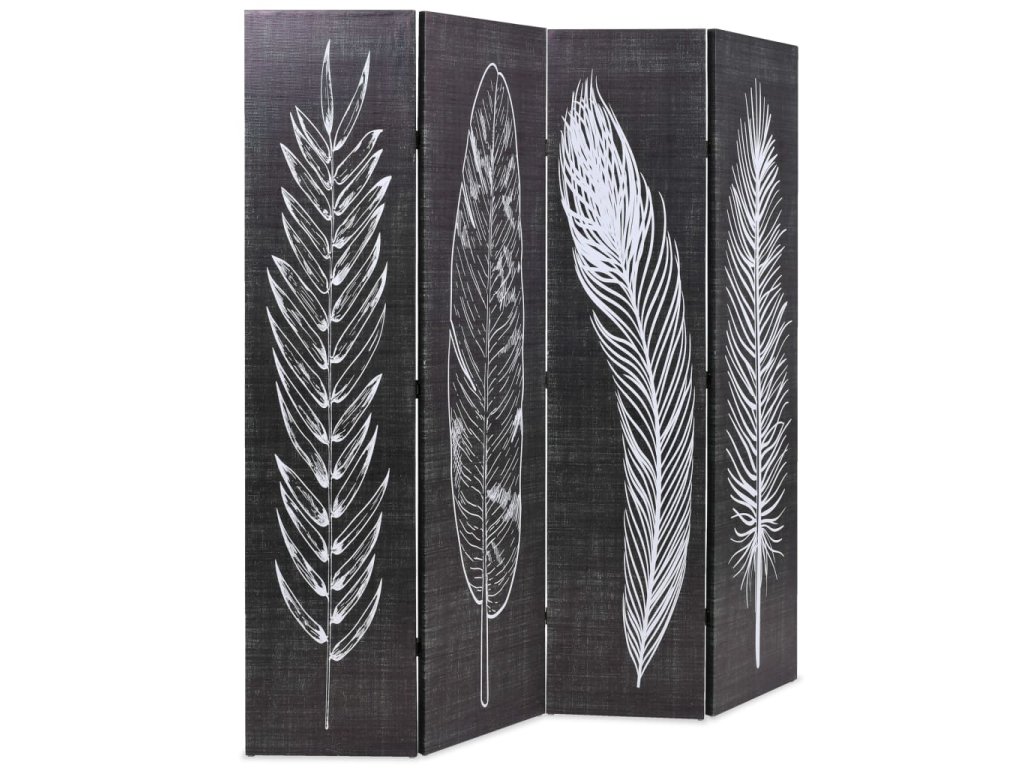 Paraván má masivní dřevěný rám a je pokryt odolným plátnem, který má na obou stranách sofistikovaný potisk na motiv pírek. Do vašeho pokoje vnese zajímavý styl a dekor. Paraván lze také snadno složit pro úsporné skladování, když ho právě nepoužíváte.