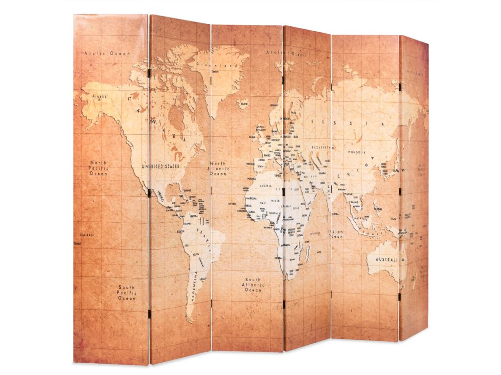Paraván má masivní dřevěný rám a je pokrytý odolným plátnem, na kterém je natištěna mapa světa v zemitých tónech. Vašemu interiéru dodá dotek moderního šarmu. Paraván lze také snadno sklopit pro úsporné skladování, když se nepoužívá.