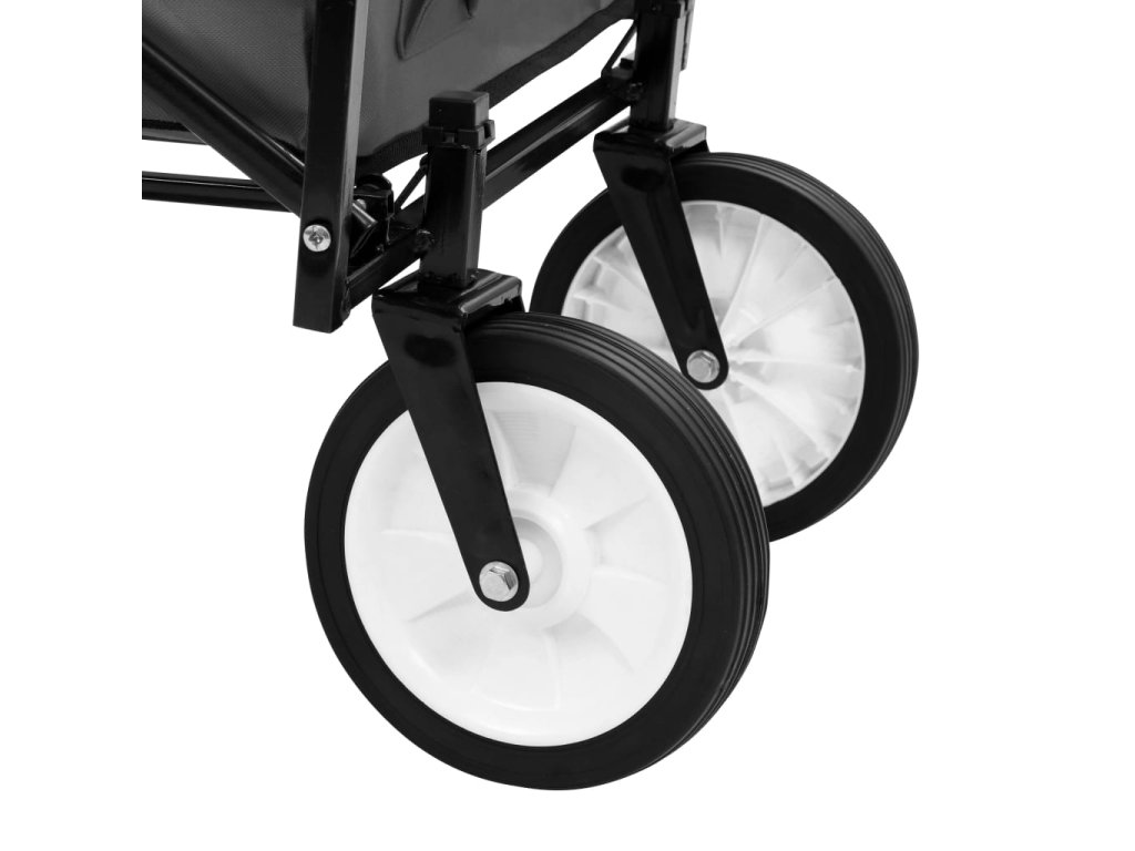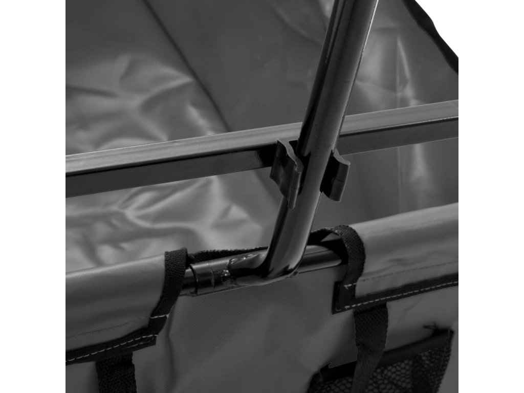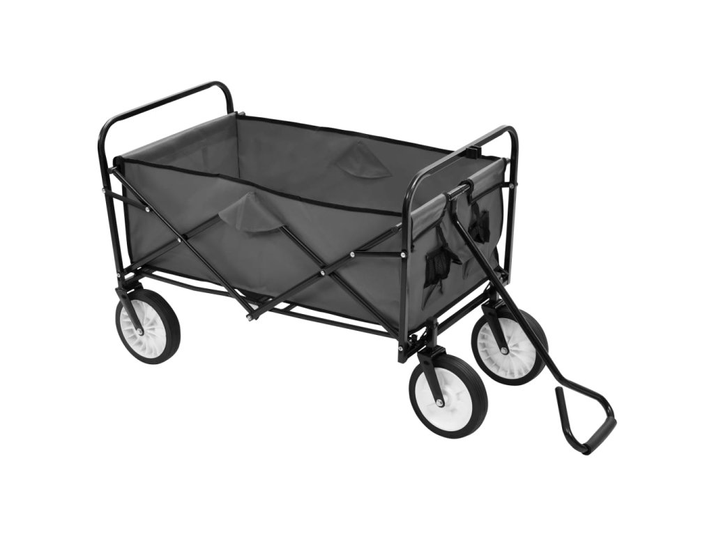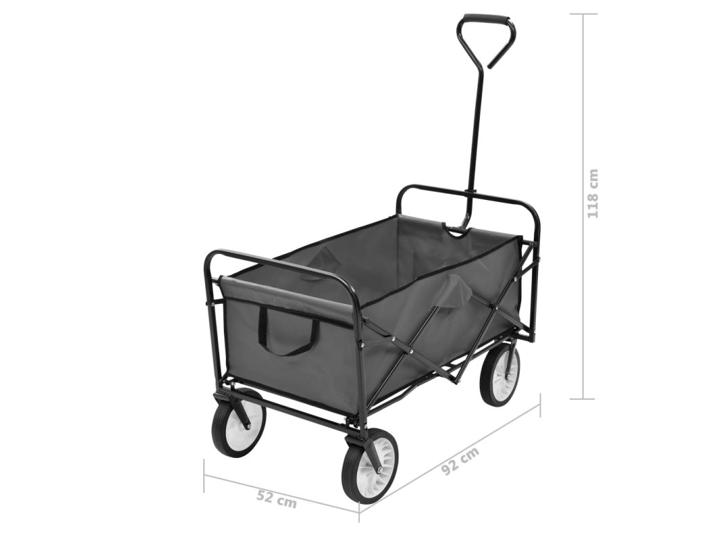 Ruční vozík je vyrobený z takových materiálů – ocelový rám a oxfordská 600D látka, které zaručují odolnost, dlouhou životnost a snadno se čistí. Vozík má nosnost 75 kg a snadno v něm převezete vaše nástroje, rostliny, hnojivo, nástroje a další. Přední kolečka vozíku rotují 360° pro snazší přejíždění před nerovný a náročný povrch. Polstrovaná rukojeť umožňuje dobrý a pohodlný úchop. Náš ruční vozík je skládací, takže ho snadno kamkoliv uložíte nebo převezete.