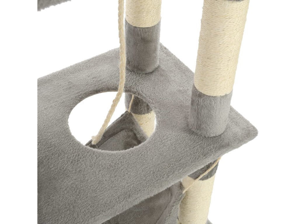 Škrabací sloupky s plyšovým potahem jsou omotány sisalovým provazem, což je pro vaše kočkovité kamarády velice pohodlné a praktické pro ostření jejich drápků. Vaše kočky si na této hračce užijí spoustu zábavy, až se budou navzájem honit a skákat nahoru a dolů. Náš kočičí strom disponuje také útulným domečkem, kde si vaše kočka může odpočinout nebo se prospat. Je navíc vybaven houpací sítí, žebříkem, lanem na šplhání, plošinami k pozorování a místy k odpočinku, takže se váš malý kamarád nebude nikdy nudit. Základna tohoto škrabadla pro kočky je pevná a stabilní.